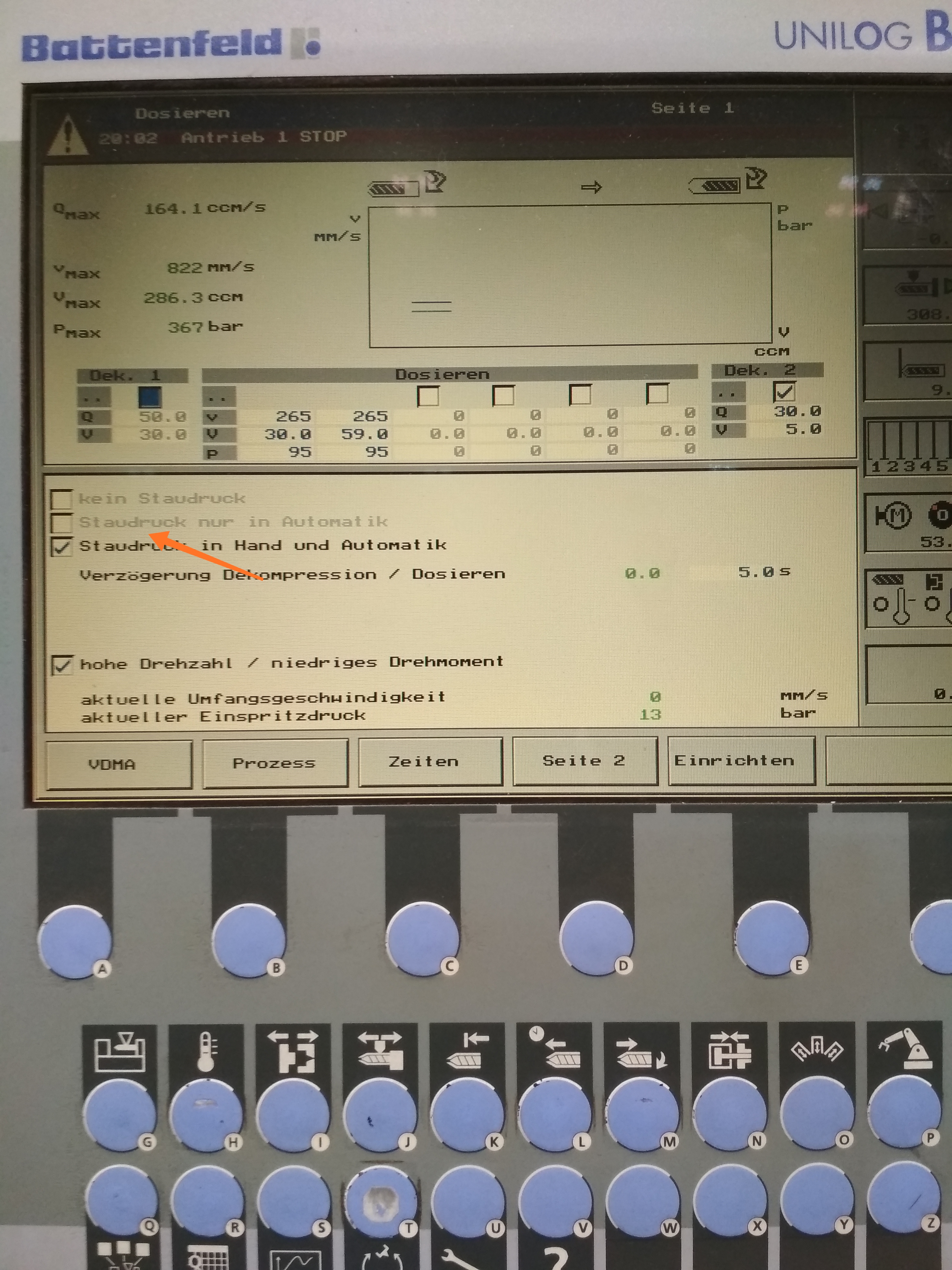 В оригинале на ф1 противодавление на панели кнопок давления впрыска, нижний ряд кажется, можно все кнопки смело отжать, там и так тяжесть конструкции дает сопротивление отводу шнека.