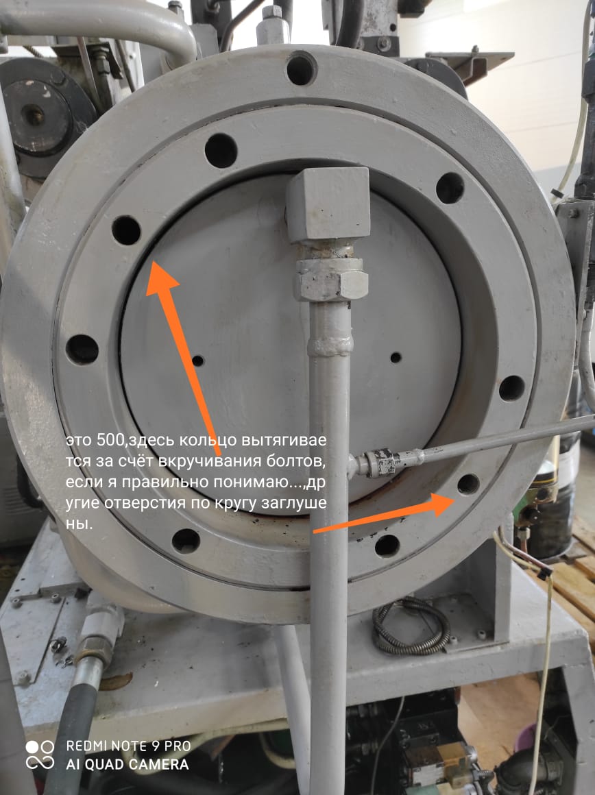 С фиксирующими болтами полуколец разобрались, есть такие с боку гильзы цилиндра и в полукольца отверстия с резьбой, технологические для удобства сборки. Но без продвижки крышки вперёд , сухари полукольца не вынуть.Тянем блин на волю меняем уплотнение. Бригада ставит новый НАР на пятисотку. Тайм-аут. Ну а на пятисотке устройство, судя по фото, большая гайка, в гильзе резьба прижимает до упора в буртик внутри гильзы крышку. Сходится мысль с чертежам. Два болта стопорят гайку. Сухарей полуколец нет. Вроде так. А крупные отверстия по кругу для крутящего момента. Вставляем пальцы цилиндрические и ломом хорошим крутим. Выкручиваем большую гайку и приспособой со шпильками вытягивает блин крышку, без продвижения вперёд ( буртик) вроде все, продолжим.