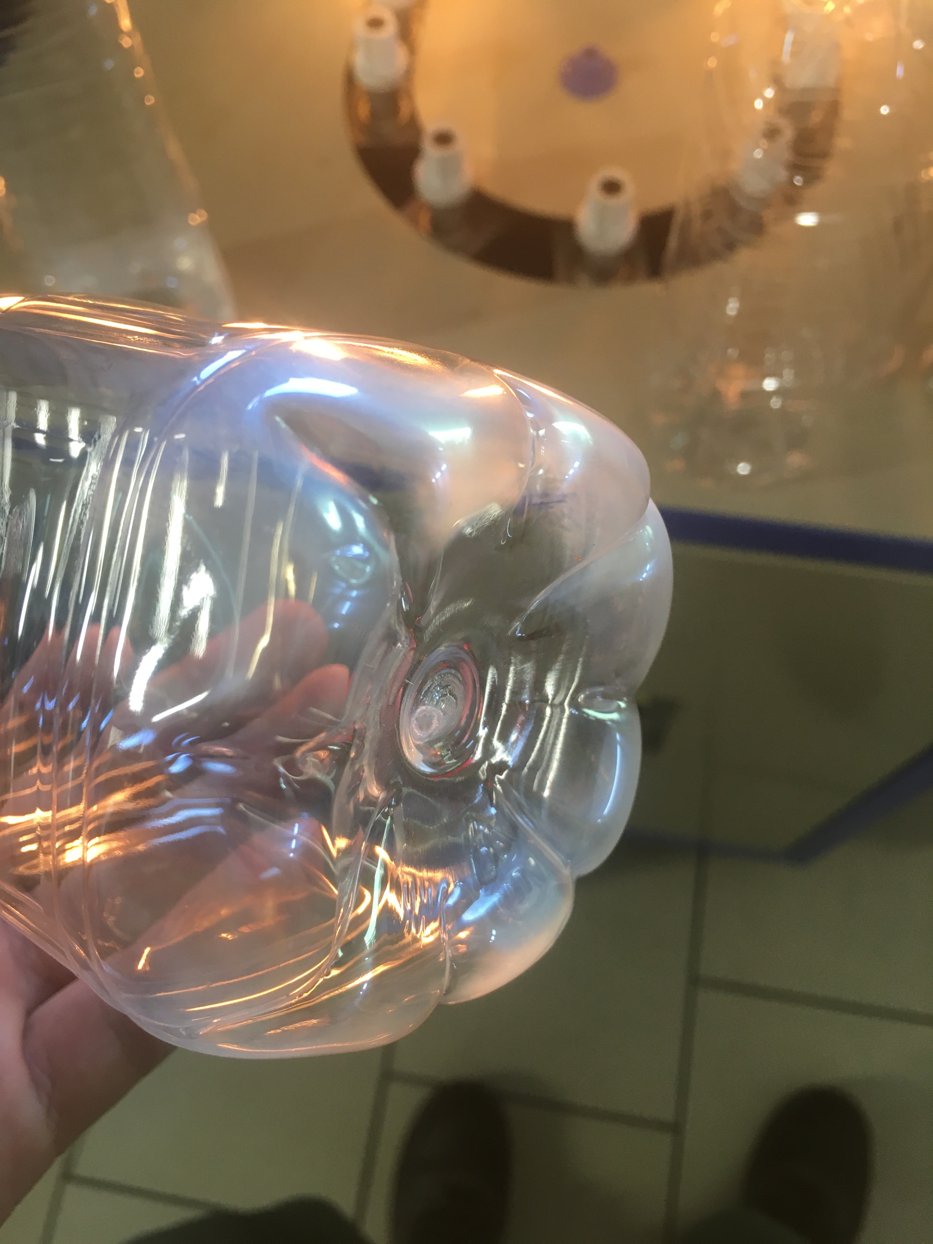 При выдуве периодически возникают проблемы с тем, что в районе горлышка не растягивается "юбка". Если уменьшить время предвыдува, то появляется мутность по всей бутылке.