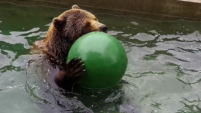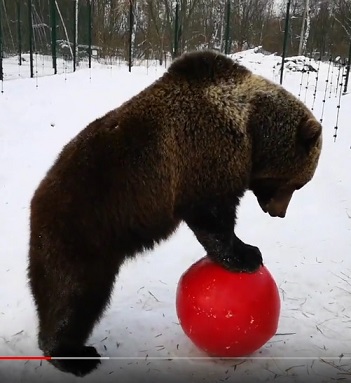 Сам медведь Мансур, для которого нужны игрушки: Это фото как раз демонстрирует как Мансур упирается и давит весом на мяч На Ютубе есть трансляция из вольера медведя, можно посмотреть как он играет в бассейне с мячом, спасательным кругом и булыжниками. А так же как пытается сломать всё, что попадётся под лапу.