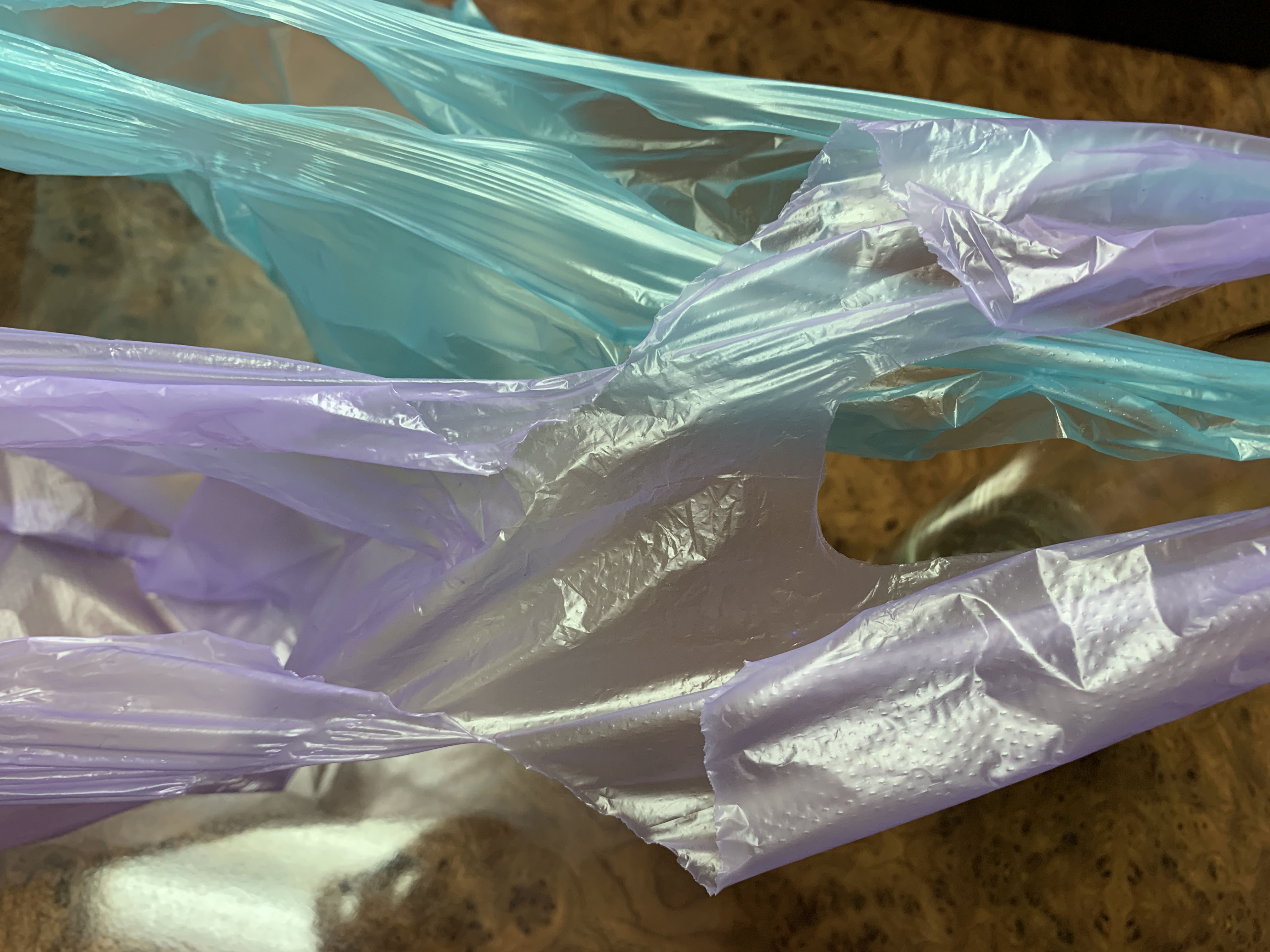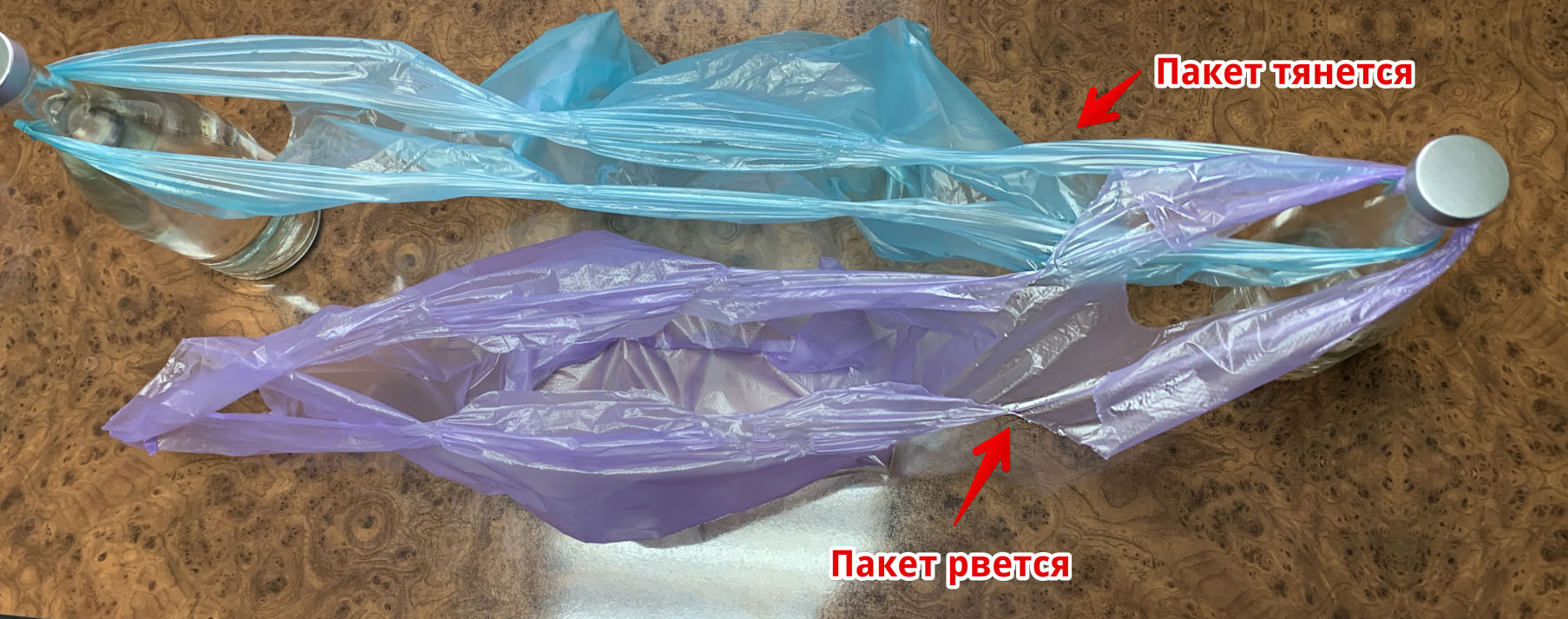 Если также за ручки в разные стороны потянуть фиолетовый образец - пакет порвется не доходя до 50-70% растяжения по отношению к зеленому образцу.
