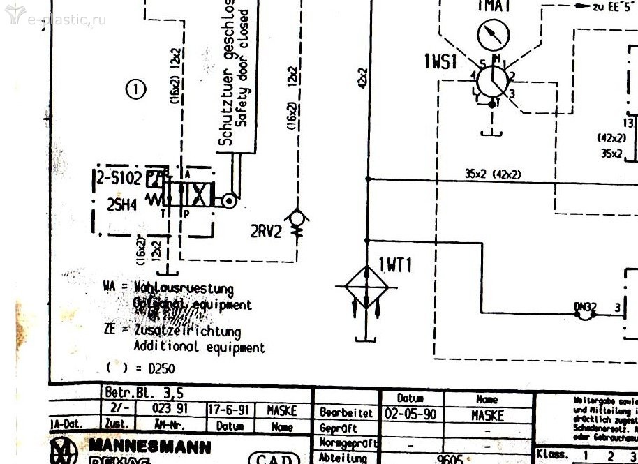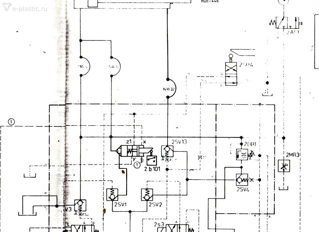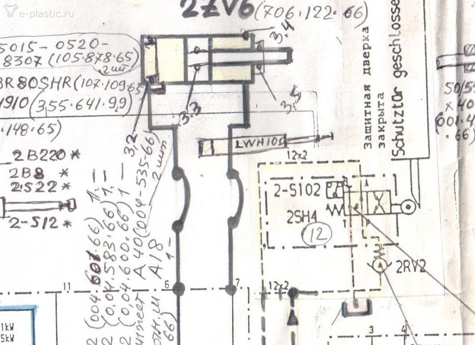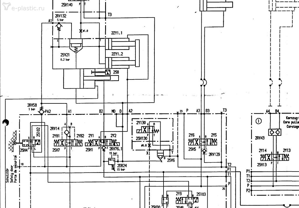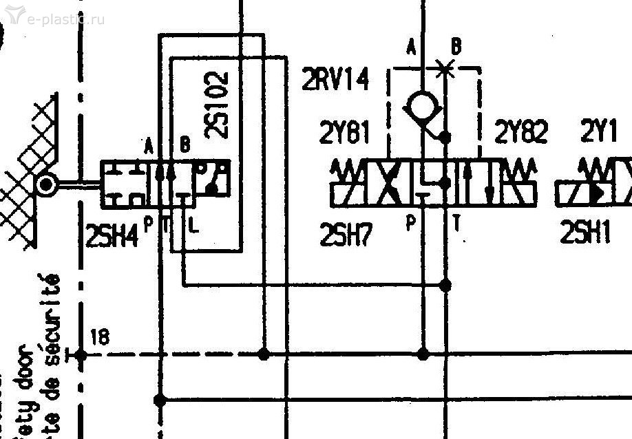 Он у вас связан механически с дверью? На машине, что речь выше, подобный концевик с дверью механически не связан (я так предполагаю). Машина большая, рычажная, и дверь большая. У меня машины 200, 250 и 350 тоже рычажные, на них гидравлическое предохранение включается через 2S3, он на двери, рядом с 2S1 и 2S2. Через него напрямую (минуя SPS) включается 2Y32 и переключает гидрозамок в закрытое положение, перекрывая подачу масла к цилиндру смыкания. На гидрозамке стоит 2S101, по которому контроллер видит, что гидравлическое устройство предохранения сработало. Вот если на ХХ от насоса будет 0 Bar, гидрозамок не сработает, и машина ошибку даст. Как то так.