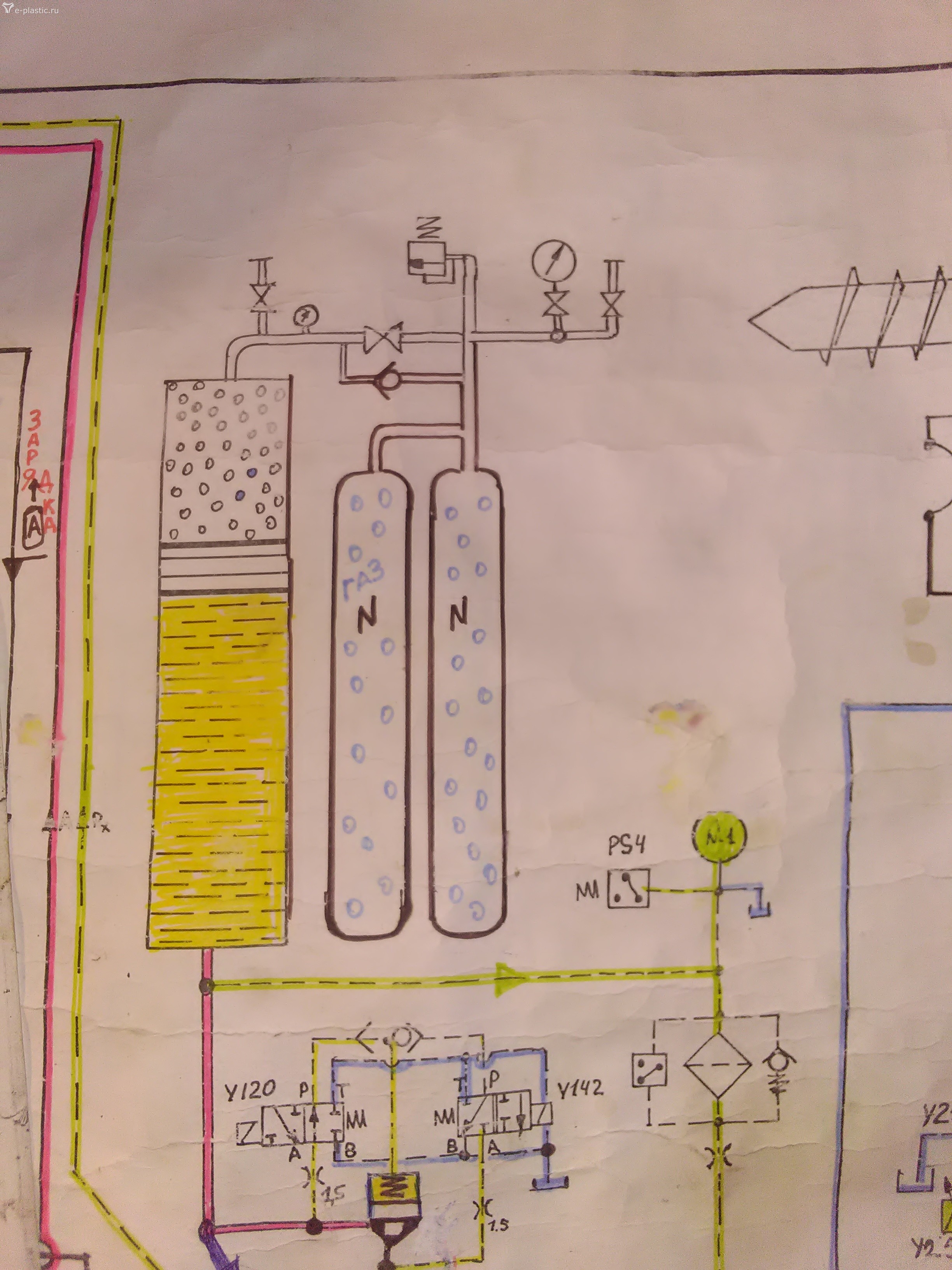 Машина Италтеш MST 850 1985 года. Схема аккумуляторной станции. Заправили азот легко сами. Но тут установлен с краном параллельно обратный клапан. Поэтому собственным поршнем цилиндра подняли периодически необходимое давление азота. Используя весь азот из баллонов привозных. Без специальной установки и вызова спецов. Загнать 50 литров на давление 150-200 бар стоит 10000 руб. А у нас четыре по 50 литров.Плюс здоровый цилиндр. В принципе должен быть обратник. Ещё не смотрели. МST 85 года заправляли просто: загоняли азот в цилиндр - масло в слив. Затем закрывали что надо открывали что надо. Включали гидропривод и он начинал нагнетать давление масла в поршень а тот перегоняли газ в остальные баллоны через обратник и так периодически пока не наберет норму по объёму и давлению.