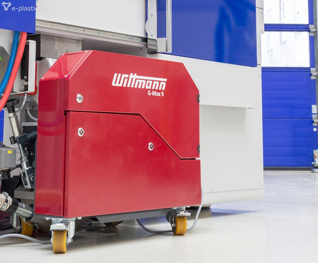 В случае с Ingrinder все иначе: здесь подборщик литников Wittmann с поворотным приводом снимает литник непосредственно в процессе литья под давлением и подает его непосредственно на стан G-Max 9, который интегрирован в систему и адаптирован для этой задачи через разгрузочный желоб интегрирован в раму машины.