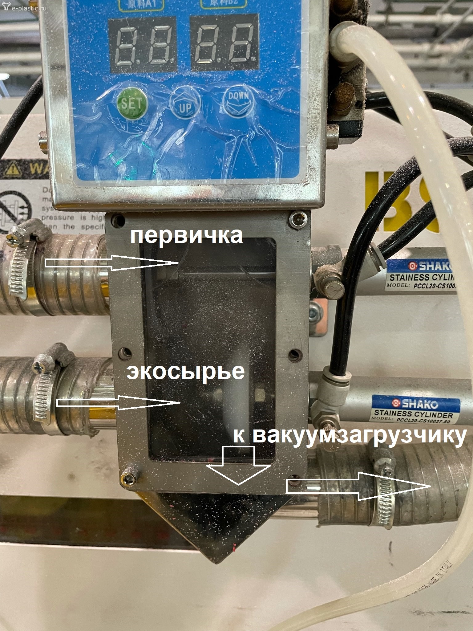 Рециклат из литников возвращается в бункер для материала.