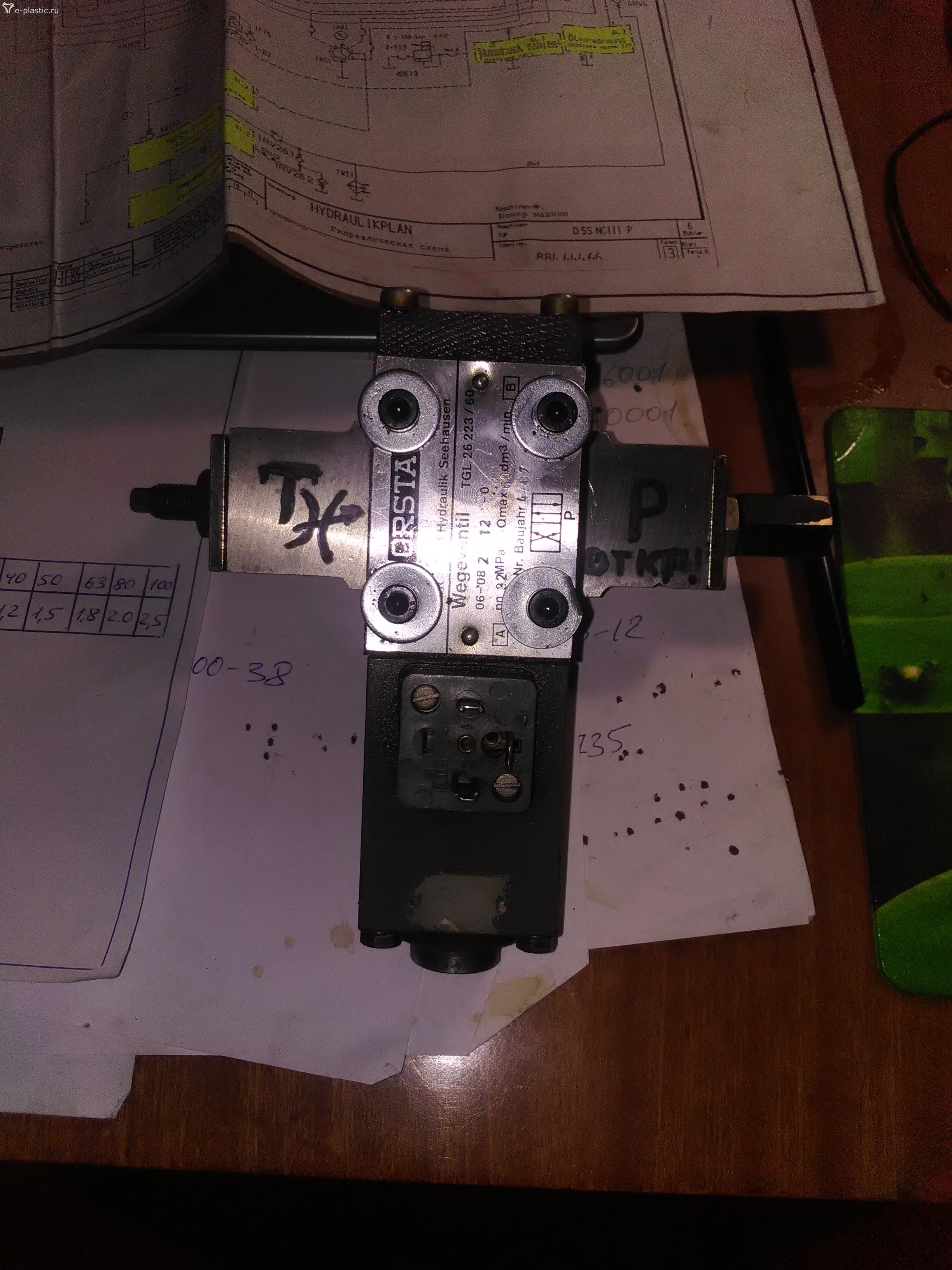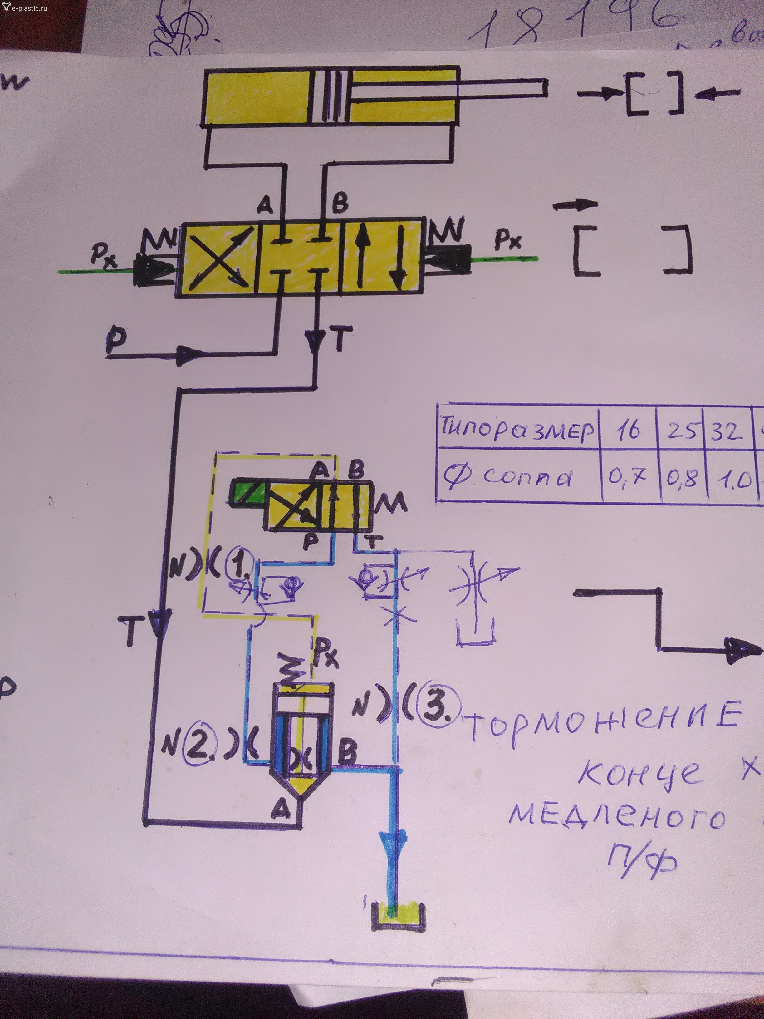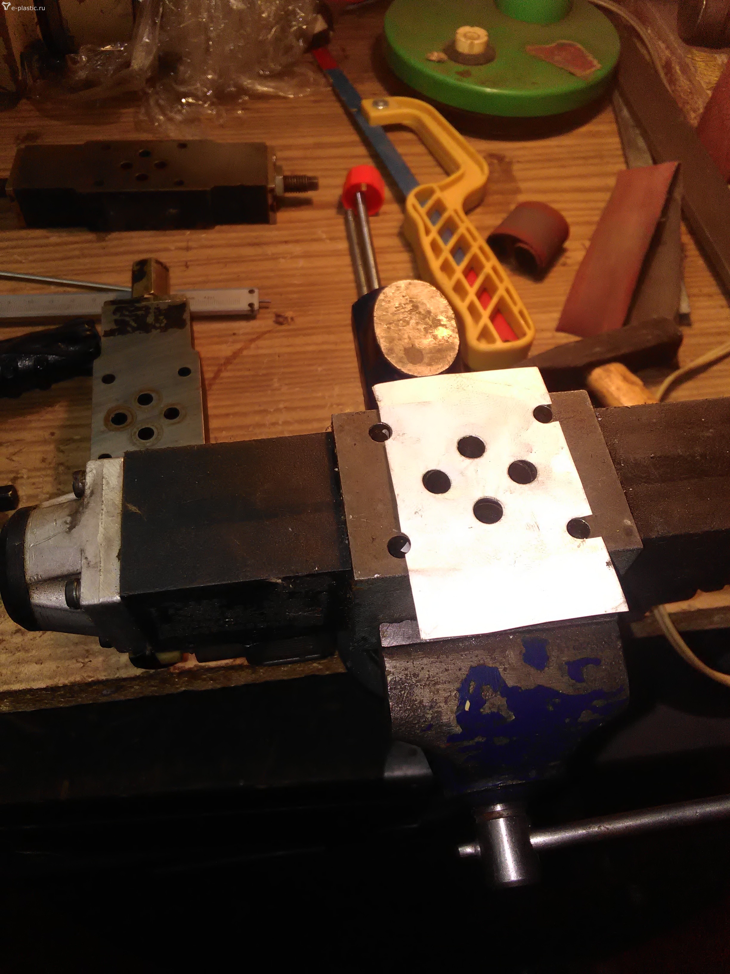 В прочем невтерпеж. Поршень этого клапана торможения должен держать две позиции. Открыт полностью и прикрыт. Прикрытие сужение условного прохода зависит от жиклера в линии Т. Если его совсем перекрыть. Клапан закроется совсем. И плита остановится. Мы в натуре видим жиклер в линии Т исковеркан. И что бы не делать жиклер опытным путём, решили в линию Т установить регулируемый дроссель и регулировкой поймать щель для торможения. Кстати жиклер в линии Т должен быть меньше жиклера в поршне иначе поршень всегда будет открыт и реагировать на закрытие не будет. Почистим бак 1000 литров , этим и займёмся. Результат и реализацию задумки покажем. Попробуем использовать дроссельную плитку модульную, но ставить придётся не штатно а повернул на 90°. Пропилив болгарской в боках для прохода болтиков крепления распределителя. Каналы р,а,б,т Немного не совпадают, попробуем. Потом Если получится торможение установим игольчатый краник в линию Т и протянем трубку ПВХ к баку 5 метров. Плитку уберем, не надежно в плане подтекания ( просто быстрый опыт)Кое что заглушим, штуцер в крышку , трубка, кран далее слив в бак. Фото будет. До и после. Что это нам даёт: это даёт безступенчато регулировать торможение при отрыве пуансона и мягкой остановки в конце открытия плиты. Правда в очень узком коридоре перехода из за большого диаметра поршня. Надо пробовать.