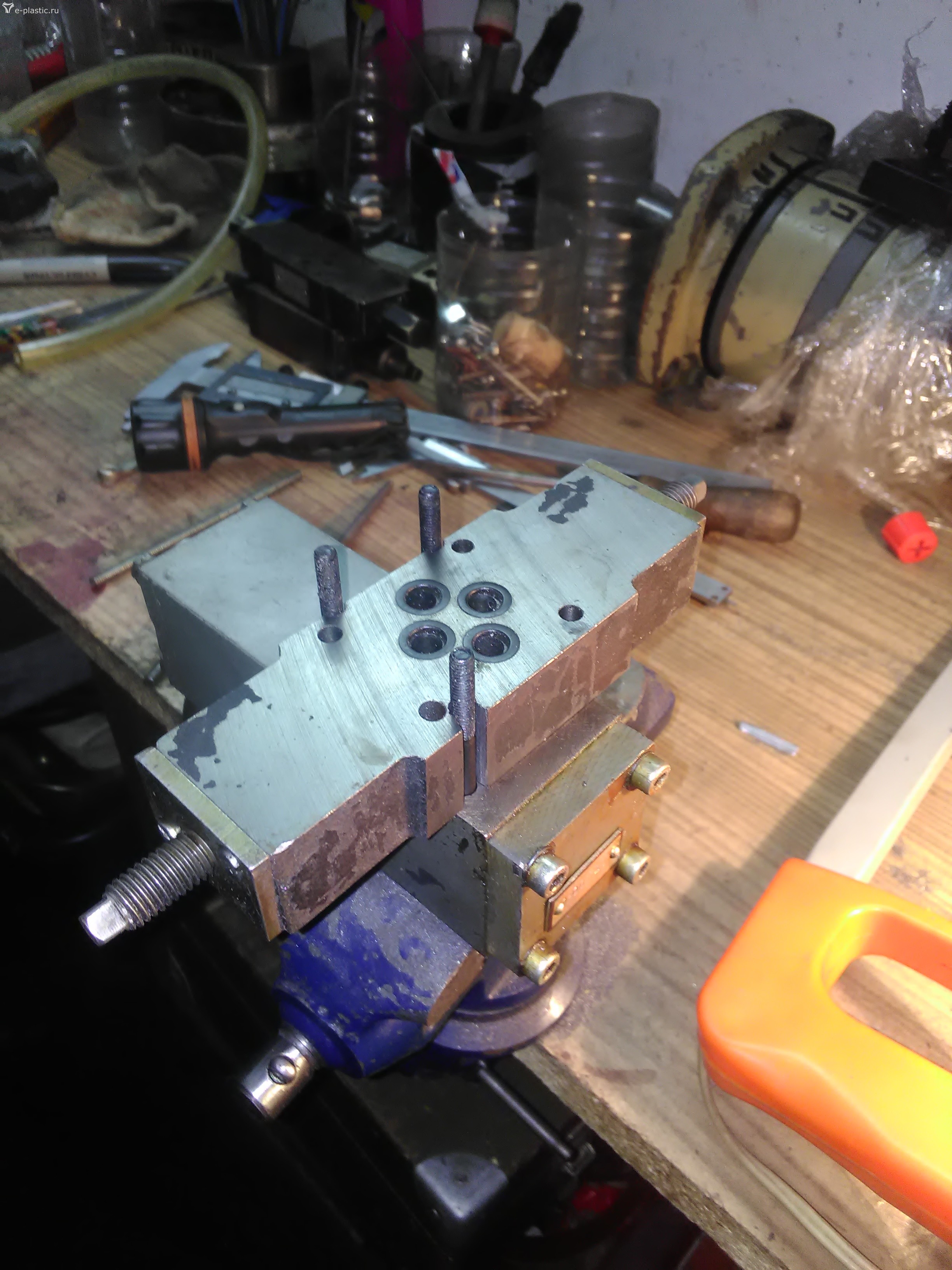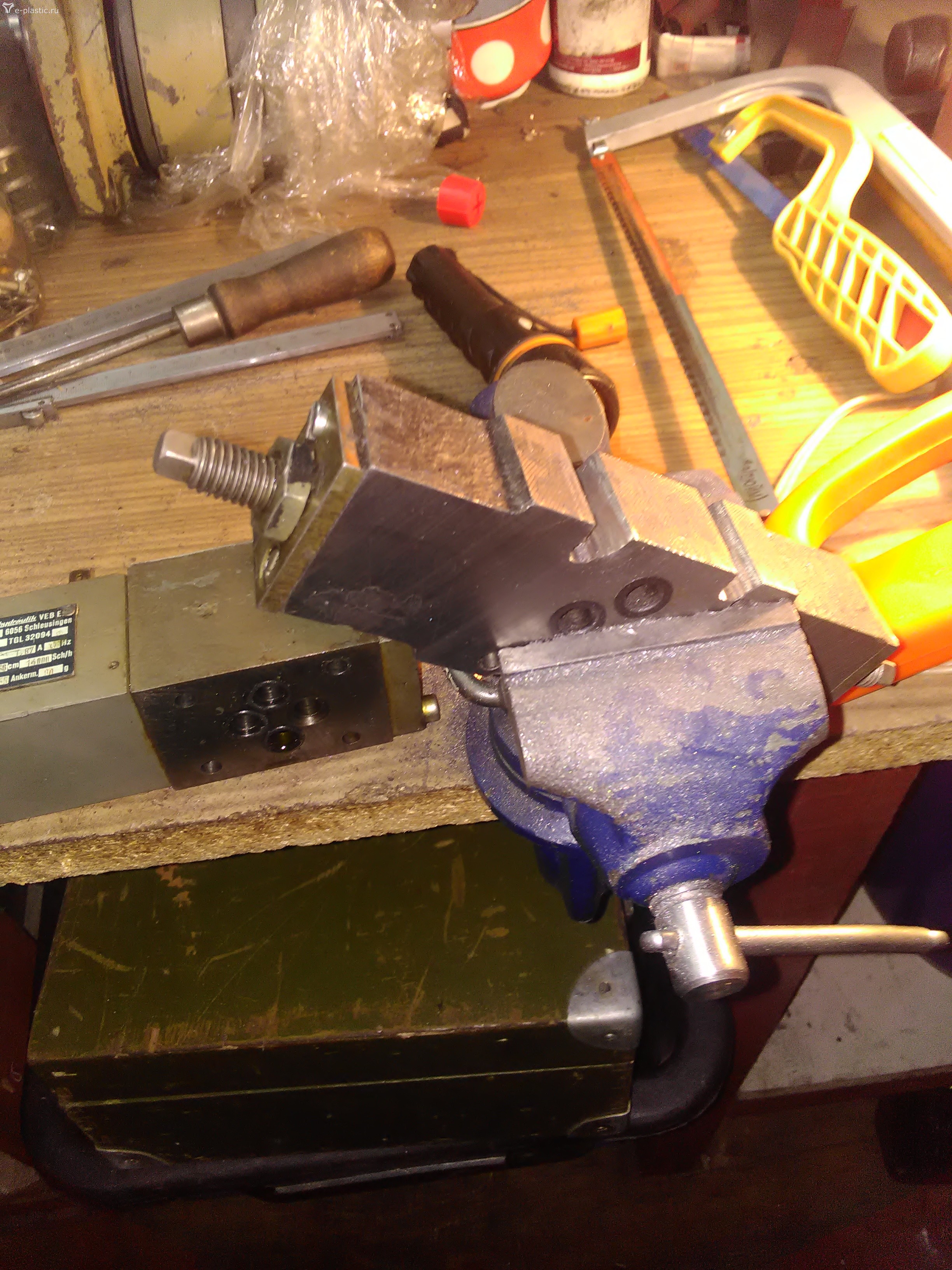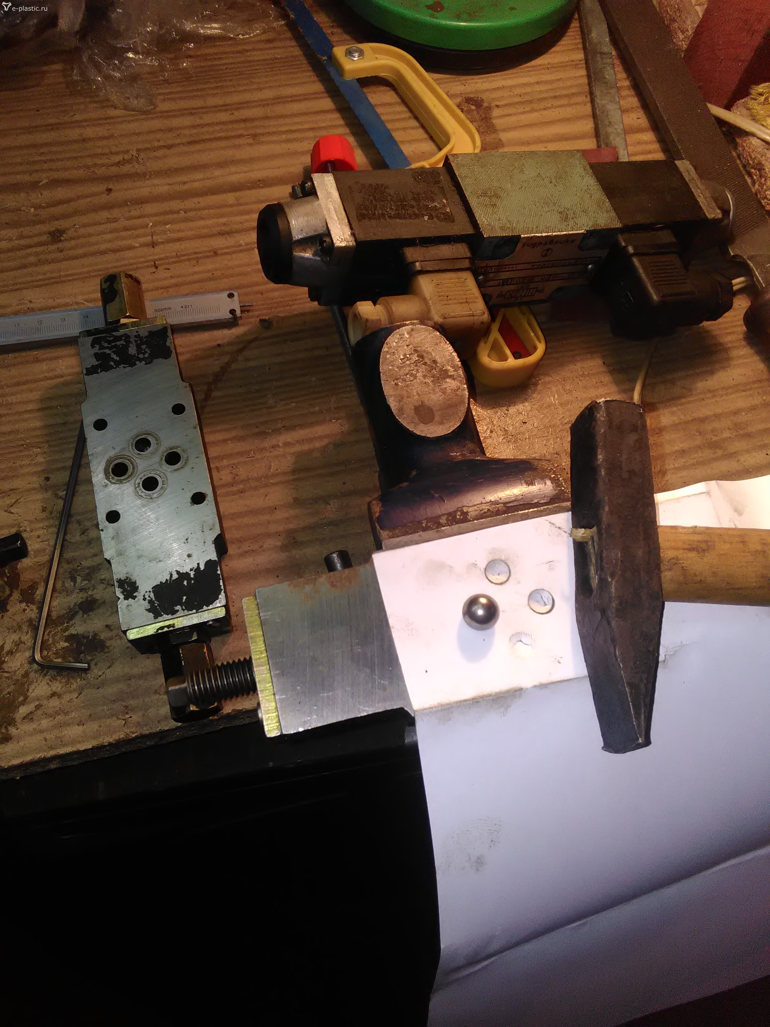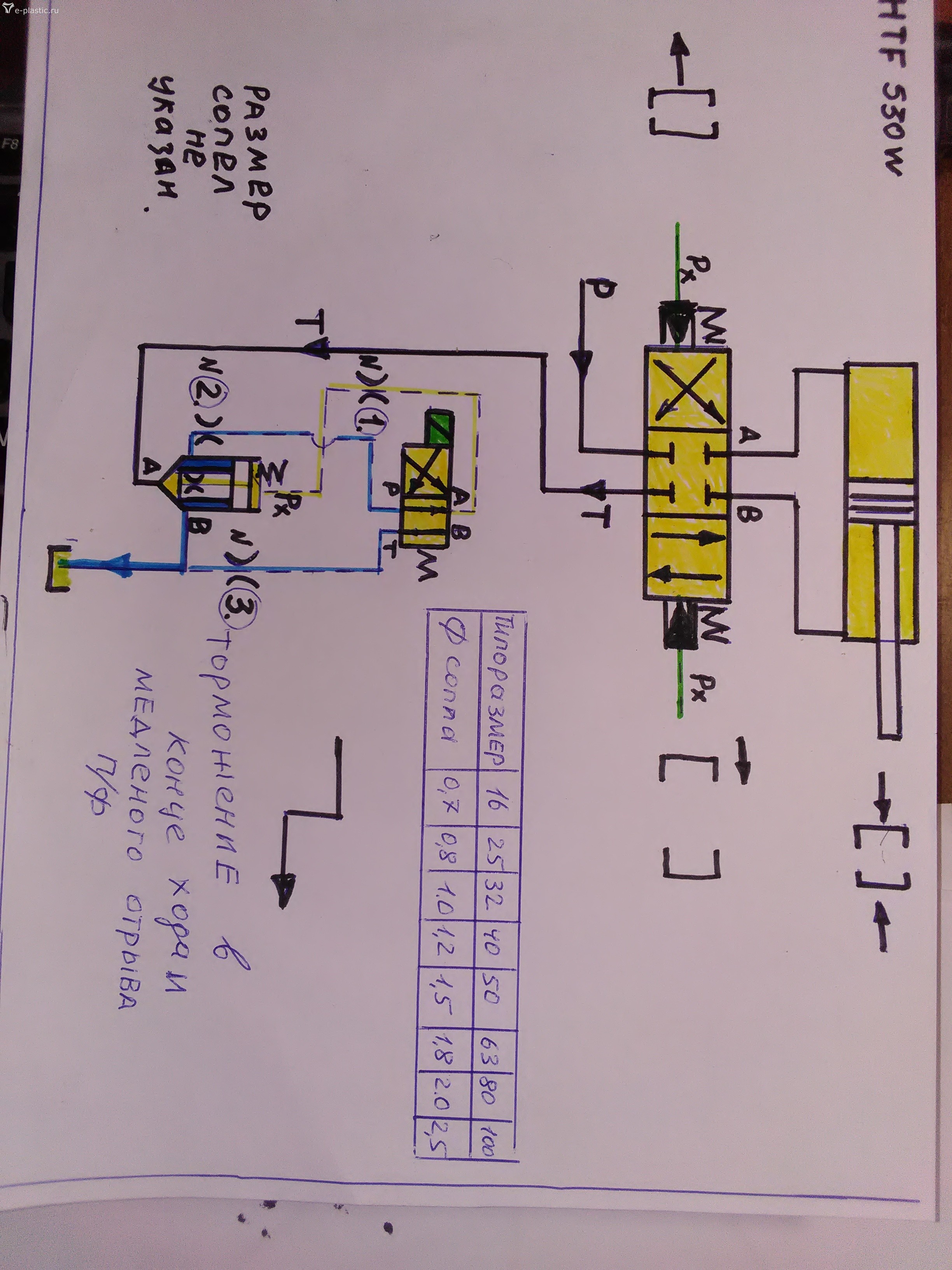 В прочем невтерпеж. Поршень этого клапана торможения должен держать две позиции. Открыт полностью и прикрыт. Прикрытие сужение условного прохода зависит от жиклера в линии Т. Если его совсем перекрыть. Клапан закроется совсем. И плита остановится. Мы в натуре видим жиклер в линии Т исковеркан. И что бы не делать жиклер опытным путём, решили в линию Т установить регулируемый дроссель и регулировкой поймать щель для торможения. Кстати жиклер в линии Т должен быть меньше жиклера в поршне иначе поршень всегда будет открыт и реагировать на закрытие не будет. Почистим бак 1000 литров , этим и займёмся. Результат и реализацию задумки покажем. Попробуем использовать дроссельную плитку модульную, но ставить придётся не штатно а повернул на 90°. Пропилив болгарской в боках для прохода болтиков крепления распределителя. Каналы р,а,б,т Немного не совпадают, попробуем. Потом Если получится торможение установим игольчатый краник в линию Т и протянем трубку ПВХ к баку 5 метров. Плитку уберем, не надежно в плане подтекания ( просто быстрый опыт)Кое что заглушим, штуцер в крышку , трубка, кран далее слив в бак. Фото будет. До и после. Что это нам даёт: это даёт безступенчато регулировать торможение при отрыве пуансона и мягкой остановки в конце открытия плиты. Правда в очень узком коридоре перехода из за большого диаметра поршня. Надо пробовать.