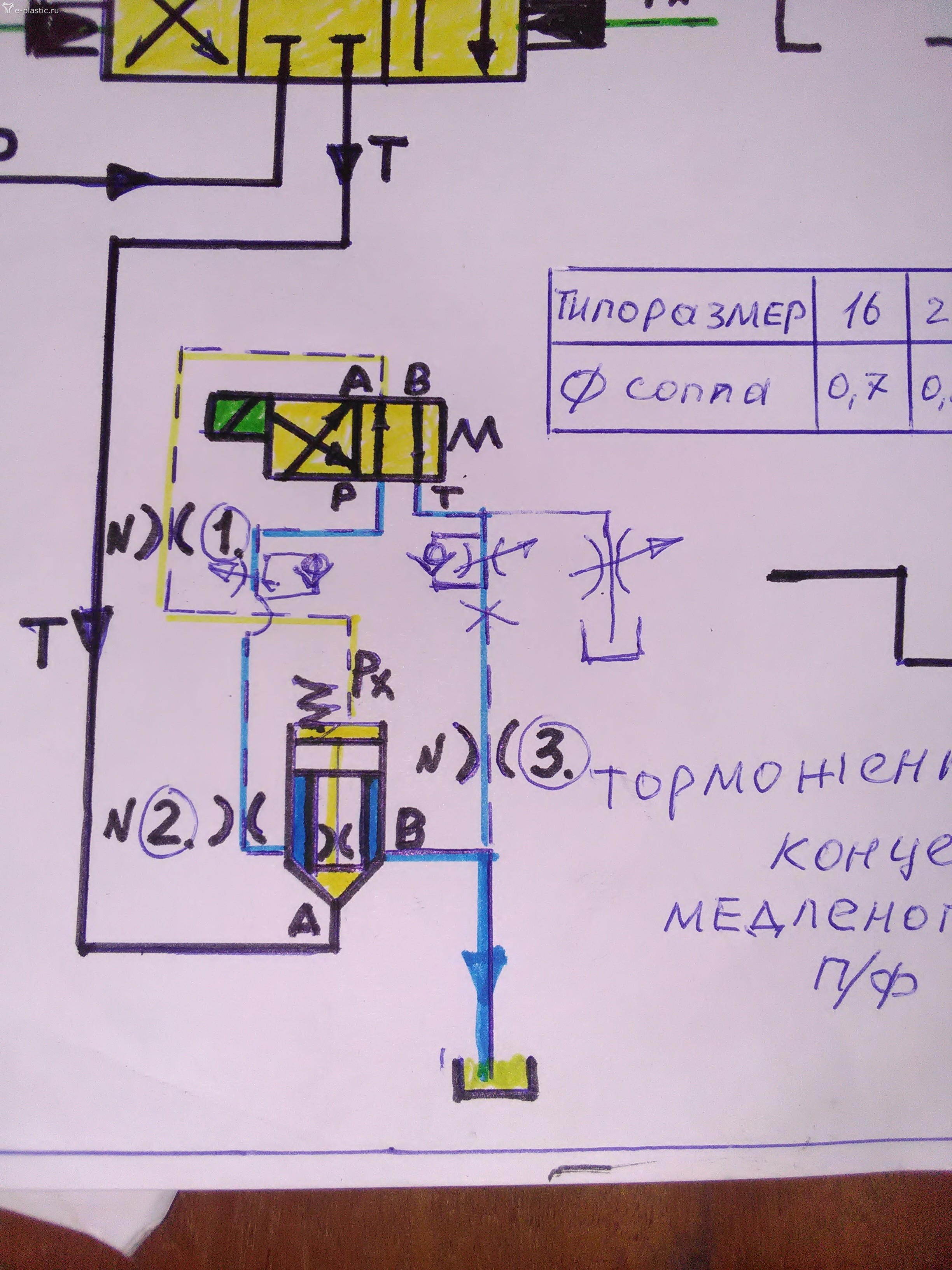 Не не будет. Когда электромагнит выключен, поршень открыт полность, плита летит, включается магнит поршень опускается но не совсем. И висит под действием сил перепадов давления и прочего , удерживая щель слива малую. Это короткий участок вначале открытия и в конце. А сейчас без торможения плита пролетает позицию на 2 см. Насосом регулируемым тяжеловато настраивать. надо наладчику облегчить работу и восстановить тупой но надежный тормоз. Ввернуть в Т жиклер 0,8; 0,9, 1мм. На схеме китайцы не написали размер. А сверлить там не где и сверла надо искать. Вот и решили иглу на слив вставить и и посмотреть как будет откликаться. После испытаний нарисую как сделали и фото. Было, стало. Не хотим жиклеры делать погонять ловить. Иглой быстрее поймем и отрегулируем. такой план. Да и удобней будет можно будет поприжать, приотпустить. Ведь на куаси 5000 например там полно регулировок с обратными клапанами и дросселями, что бы динамику сделать хорошую и вперед и назад.. Массы большие, инерция , скорости. Плавность нужна.