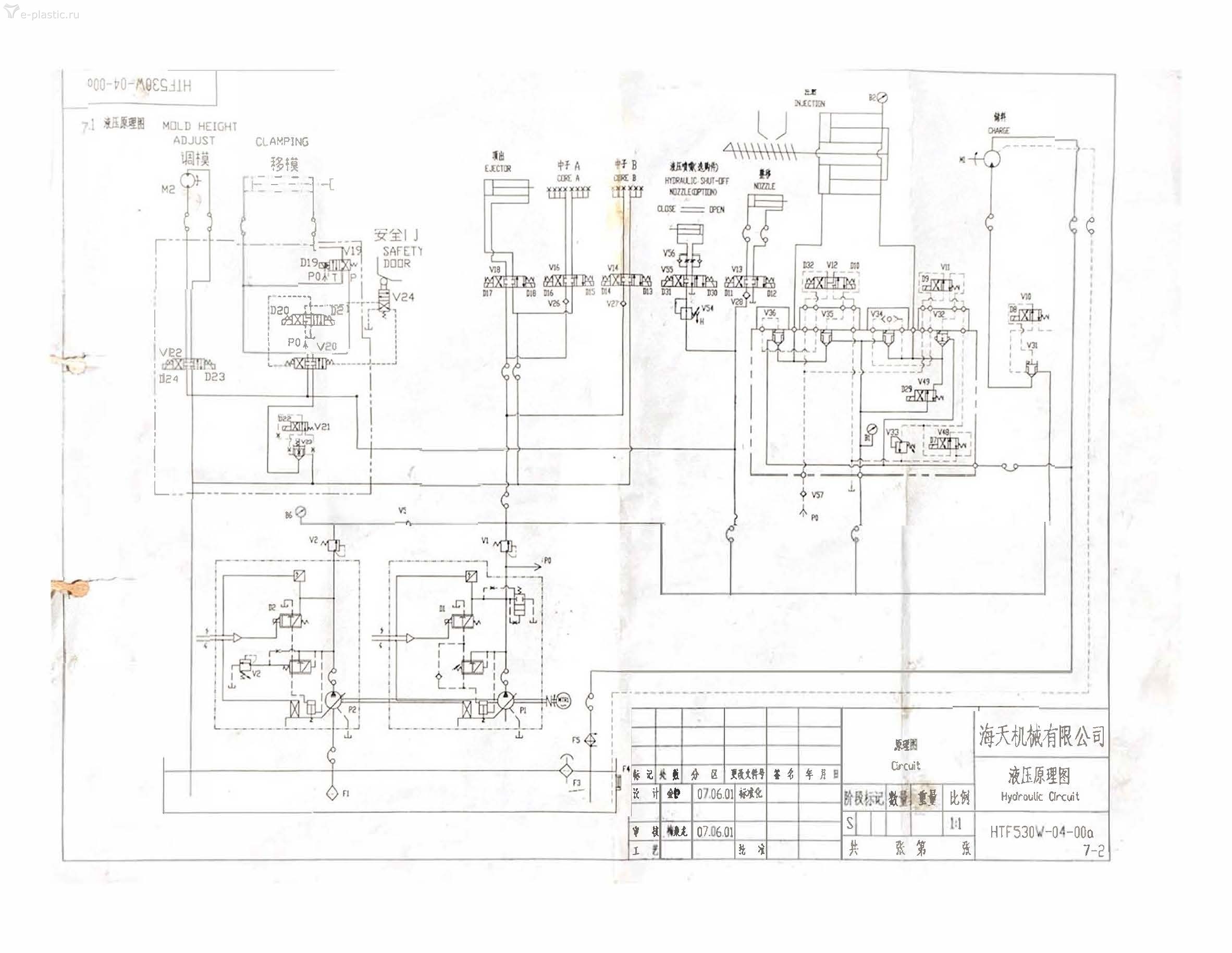 Отчет по торможению, ограничению слива из цилиндра смыкания размыкания. Не стали терять время на изготовление группы жиклеров. Менее 1мм. Поставили приспособу с регулируемым жиклером. Жиклер закрыт полностью- слив перекрыт движения нет. Потихоньку регулировочным левым винтом открываем. Очень медленно начинает плита двигаться. Отрегулировали до желаемой скорости. Плита позицию конечной остановки назад пролетать на 20 мм перестала. Благодаря плавному ходу в конце отвода плиты. Вывод: ( Подобрать жиклер). Оказалось это часть проблемы. Если взглянуть на схему, то видно что в системе нет регулятора потока и регулятора давления. Все делает насос переменной производительности. И не удается настроить с монитора ускорение, замедление насосом перед торможением.Резкий сброс скорости перед торможением( не из за нашей приспособы- проверяли) Задача разбираться с линейкой, сигналами на пропорциональный клапан насоса, контроллером.... Работу насоса проверим принудительно в ручном режиме послав поток на гидромотор и по показаниям тахометра убедимся что насос управляется нормально от минимума до максимума. Для доказательства что гидравлика на машине в порядке. Дело за монтером как скажет Артур. Ну и в принципе очередные грабли. Наперед батьки в пекло. Псевдоним Батька это