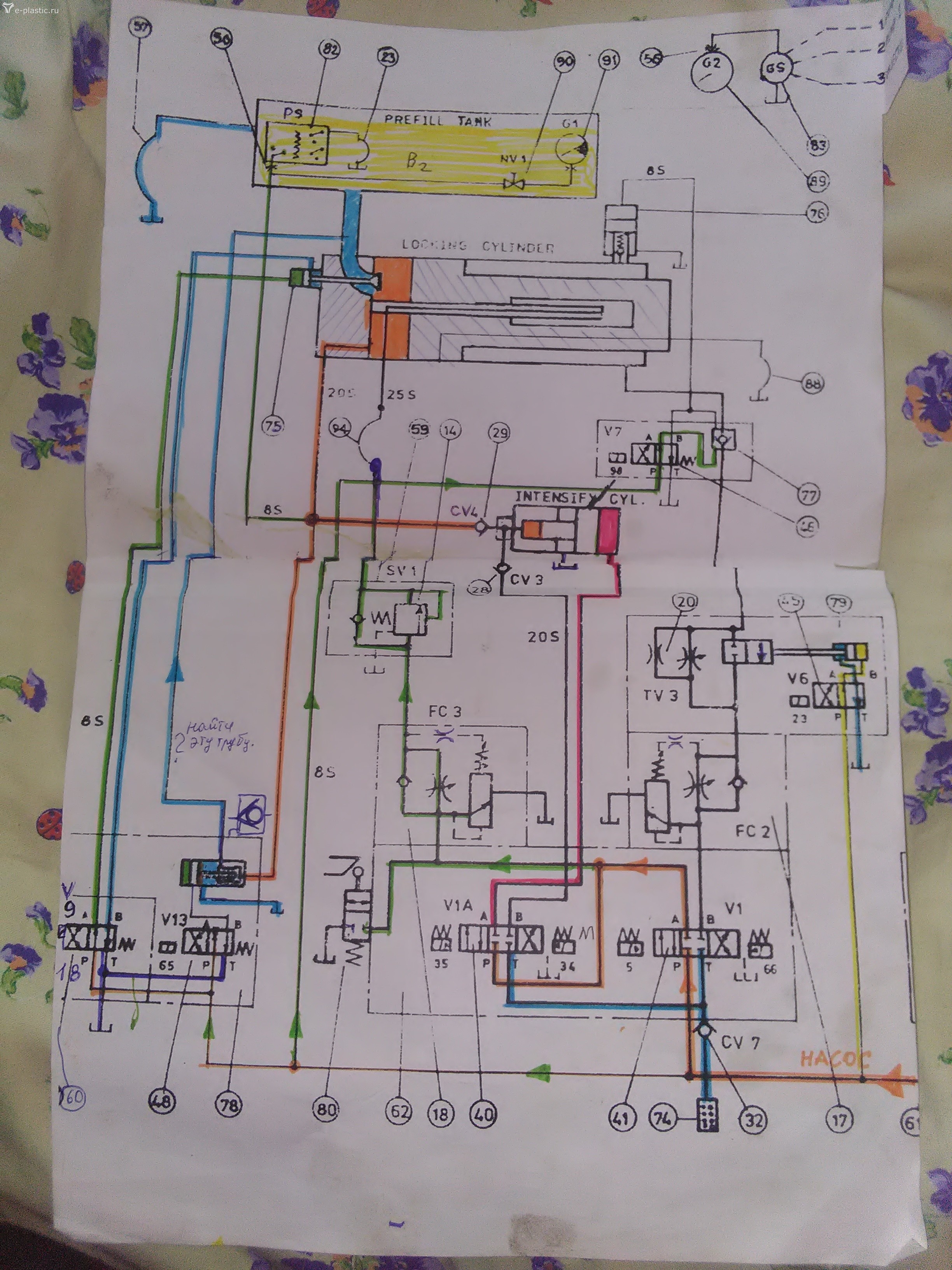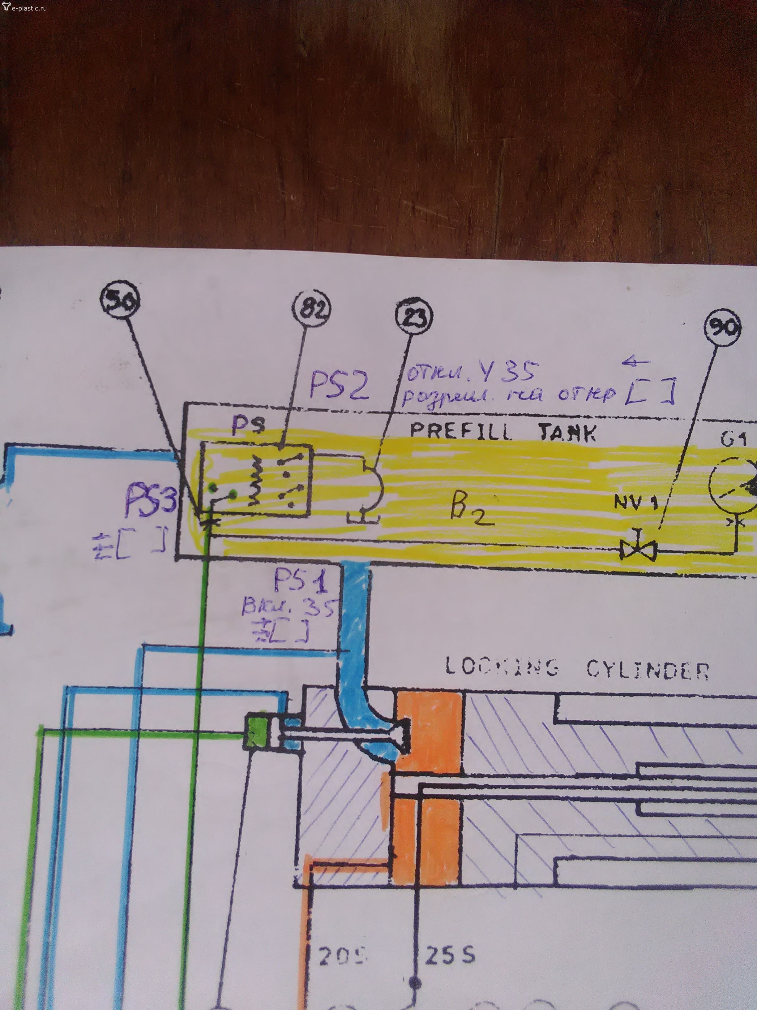 Ссылка zdoba на ТПА 80 тонн. Мультик отсутствует. Соответственно куска схемы на это действие нет. До завтра. В оригинальном паспорте будем смотреть. Версия чуйка такая: К.В. LS4 контролирует полное закрытие формы. отключает защиту инструмента и включает закрытие двух главных обратных клапана У9 и включает У 35 приводящий в действие мультипликатор но с LS4 последовательно в цепи сидит вероятно микрик на реле давления PS. ( Догадки) Грешить можно на электрику раньше времени включается У35. Блудим в трех соснах. В системе все давления присутствуют и контролируются. Кроме зажима. Что интересно: Убираем концевик переднего исходного формы ЛС4. Включен У34. И рукой принудительно пересилив катушку У34-го нажимаю У35 и давление ЗАЖИМА стабильно . ЕСЛИ Штатно, не всегда или вообще не набирает. Э/М 35 - катушка 220 вольт исправна золотник управления доходит нормально. Распределители идеальны. Ступор какой то. И где тут микрики три штуки. Контроля ЗАЖИМА?????
