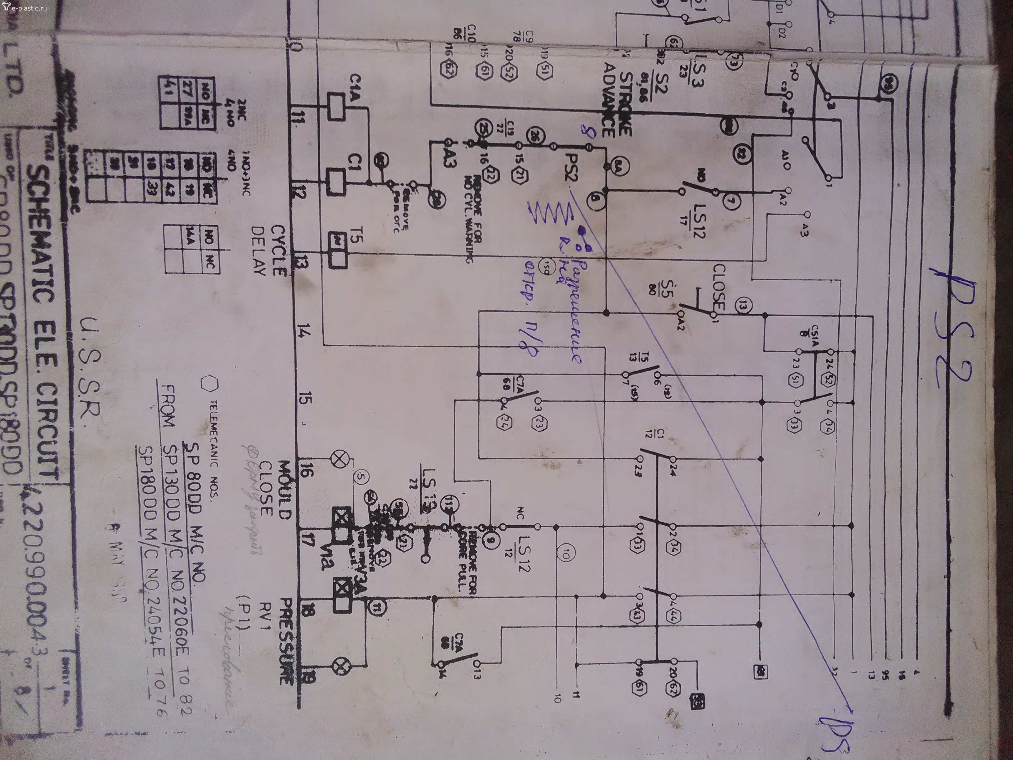Если думать по логике. В паспорте отмечено что PS это реле давления двойного назначения. Низкого давления и высокого давления на зажим формы силовой до 1800 кн- 180 тонн. Предел и сила зажима устанавливается смещением верхнего микрика Нижний микрик отвечает за сброс давления контролирует что сброс произошёл, можно форме открываться. Средний, чуть выше нижнего. Активируется при возникновении низкого давления с переходом на высокое давление. Вроде так? Опять вопрос от какого концевика включается Y 35 электромагнит на работу мультипликатора гидроусилитель который обеспечивает давление в цилиндре зажима превышающее давление в гидро системе от насоса .