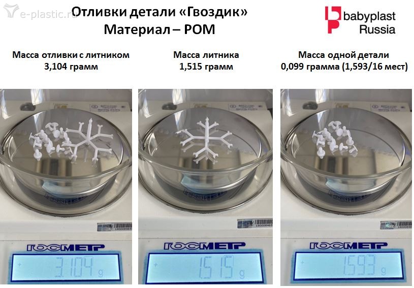 Третий аргумент заключается в том, что на стандартных термопластавтоматах достаточно проблематично получить детали весом десятые или даже сотые доли грамма. Почему проблематично? - потому что сложно делать впрыск такой маленькой навески, а чтобы делать нормальную навеску хотя бы в 20-30 грамм надо делать прессформу с очень и очень большим количеством мест. А чем больше мест - тем дороже форма, сложнее балансировать литниковую систему, объем литниковой системы больше, тех процесс литья сложнее (как вы будете собирать 32 детали размером 2*1 мм при цикле 9 секунд???) и т.д. Если надо производить сотни миллионов деталей - то ОК, а если несколько сотен тысяч -это большие расходы на пресс-форму или проблемы в стабильности самого технологического процесса (например на Babyplast, мы эксплуатируем прессформы с количеством мест 16 шт. и объемом навески 3,1 грамм, вес одной детали при этом - 0,099 грамма. Производительность - свыше 100 000 деталей в сутки. (на самом деле самое большое кол-во мест в прессформе Babyplast что мы делали равно -64)