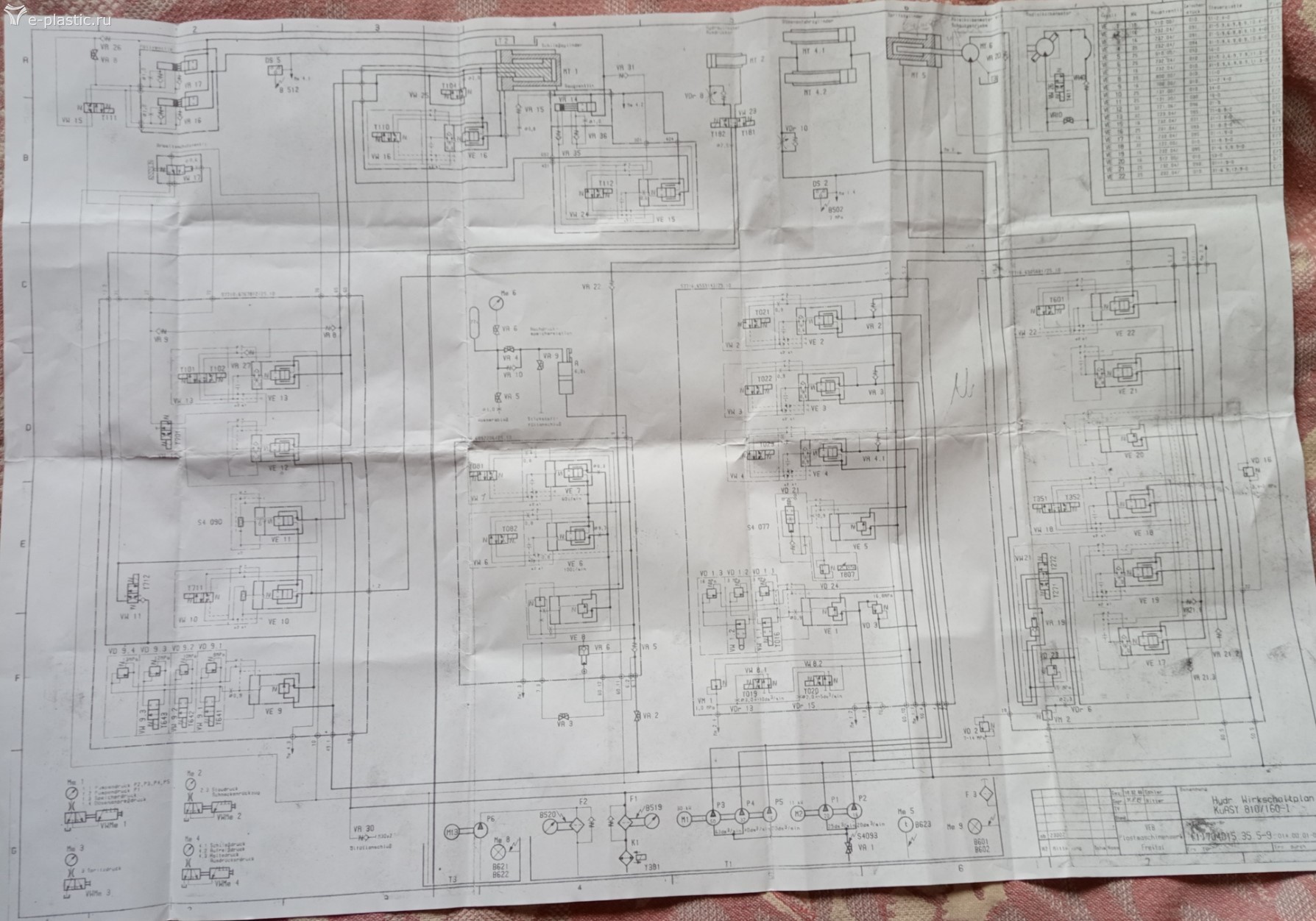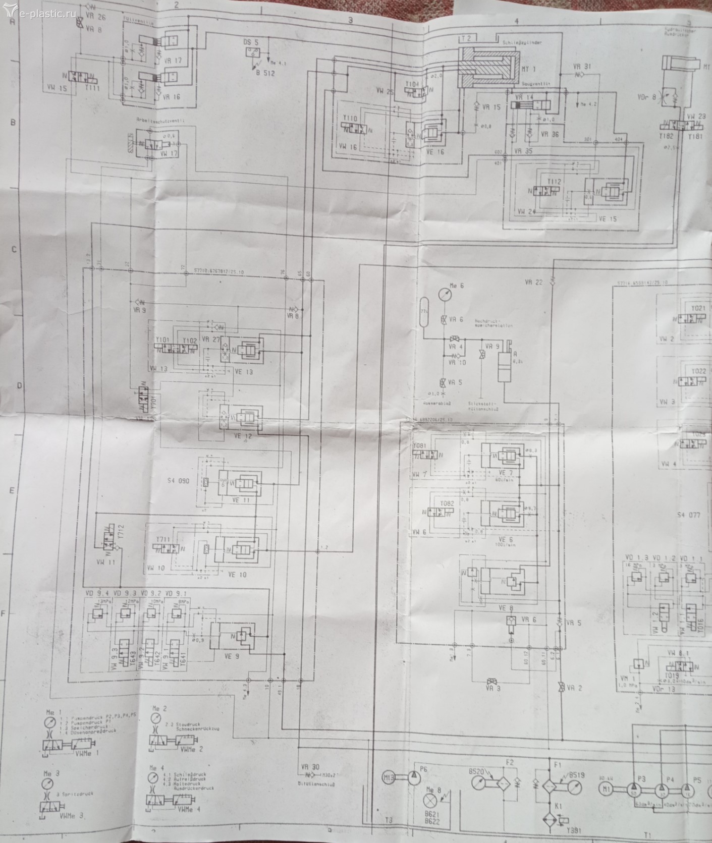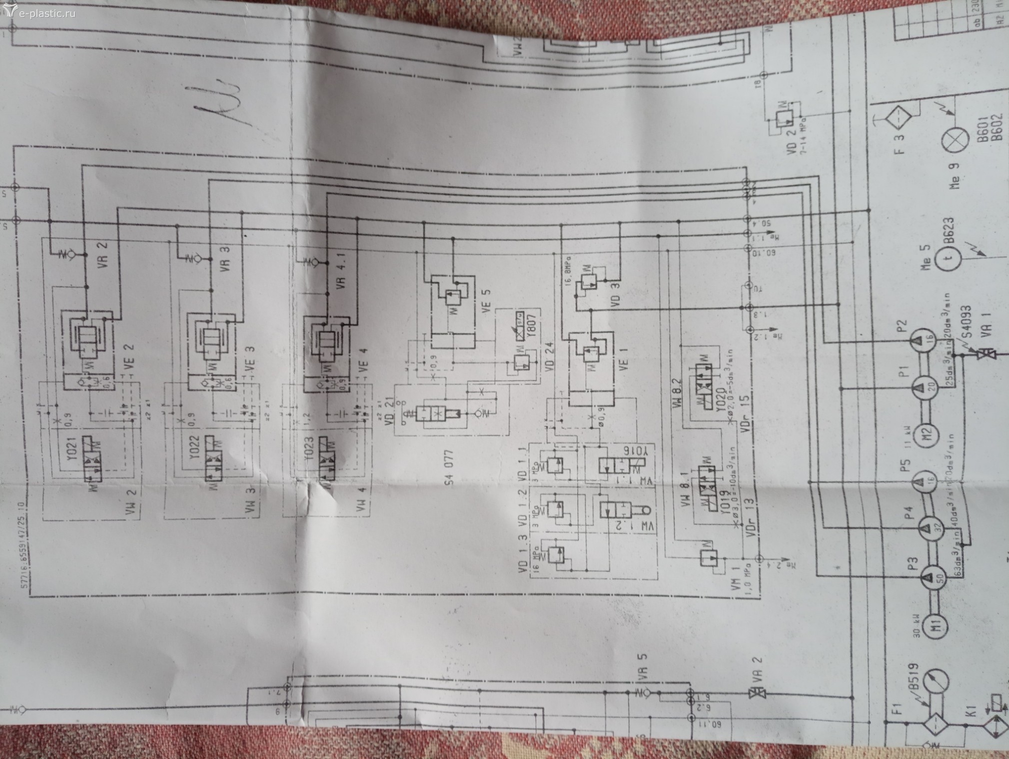 Теперь вернусь к тому, с чего началось. Теперь знаю, почему проскочила ограничение хода - пробило выход в драйвере на Y112, включился постоянно вот и результат . Это "ремонтники" не устранили. Разобрали вот этот блок гидравлики (основные давления и скорости) Красным обведена та часть, которую увозили для "настройки" Сам в гидравлике не особо тяну, могу по мелочам только. Моё электроника-электрика, хоть и работаю наладчиком (нравится). Грешу на неправильную настройку дросселей, на узле, который "настраивали", попробовал покрутить самый крайний справа - результатов нет, остальные опломбированы - трогать не стал, хотя и который крутил тоже когда-то был опломбирован. А, вот ещё, вспомнил, так как выход в драйвере так и остался пробитым при мне опять не остановилась. А работать надо. Посмотрел по г.с. - вроде этот Y112 создаёт высокое давление(?) в контуре запирания-открытия. Снял с него колпачок, работает, но на тяжёлых формах не открывает, приходится на электромагнит нажимать.