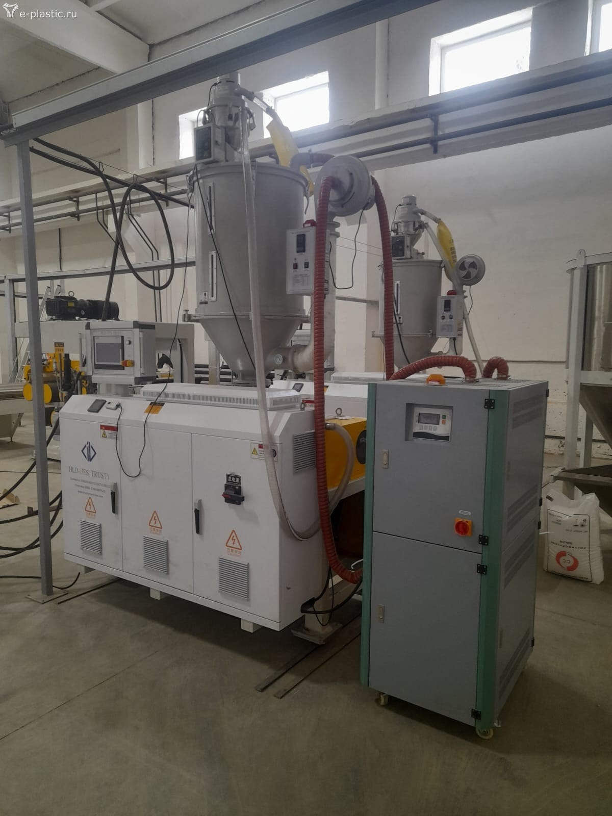 Весового дозатора не увидел, нужно фото загрузки сырья в экструдер с другой стороны, обычно он обозначается как loss in weight feeder или gravimetric feeder.