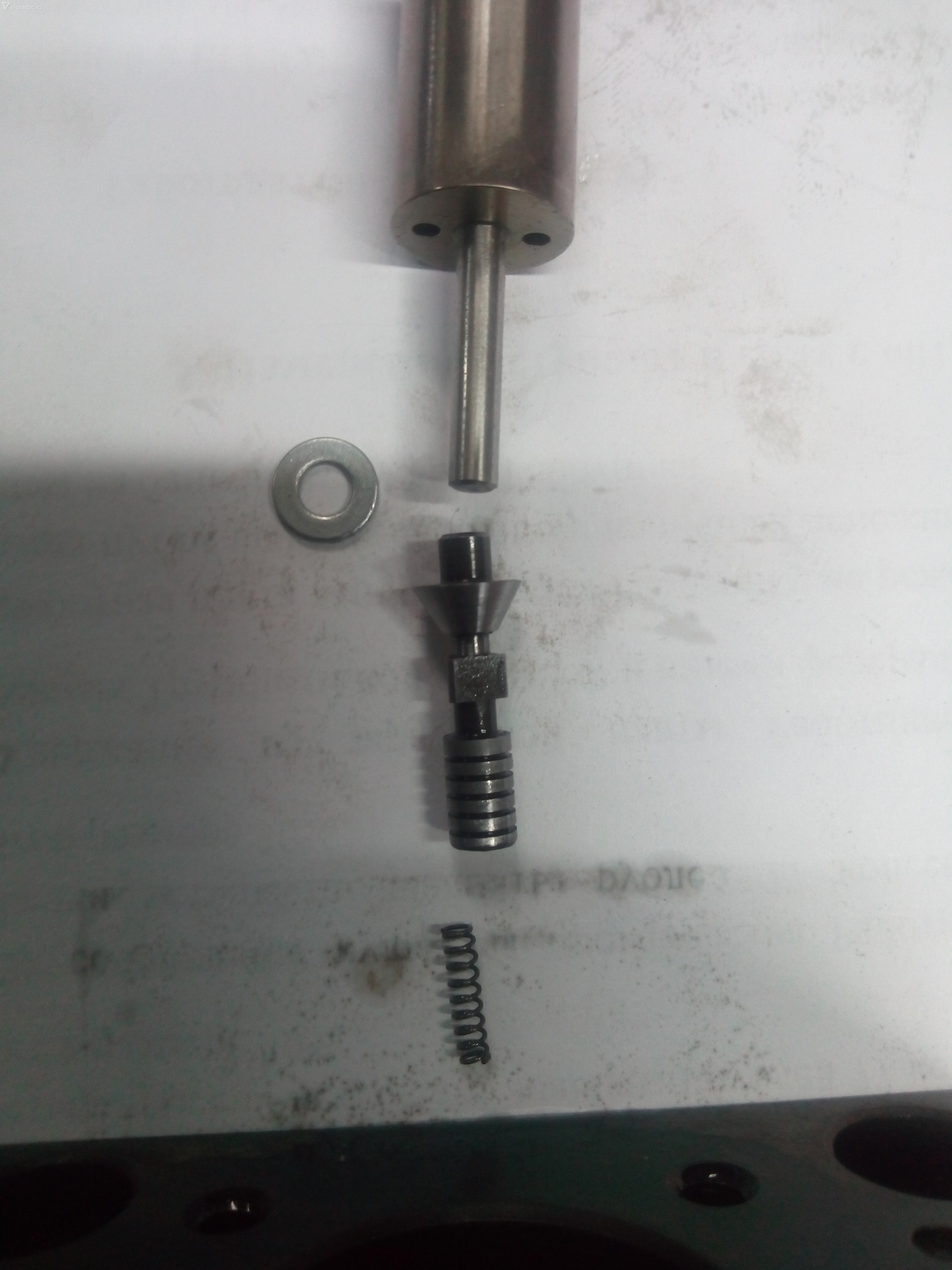 Собрал, установил. Дай думаю проверю. Запустил термопласт.... О чудо!!! РАБОТАЕТ. Причина - пружинка подсела( на фото мелкая). Пружинку то заменю, только надолго ли хватит. Золотничек люфтит. Спрашивали про клапан, верхний правый- я думаю скоростник ( намагниченность катушки меняется при проходе флажков через датчики) Другого способа проверки не имею ( гидросхемы, осцилографа нет, цэшка показывает 24 вольта постоянно). А вот прпорциональник внизу по середине включается при подаче питания на тпа, даже при выключенном насосе и работает постоянно. Если его отключить, то давления в системе нет ( для чего?).