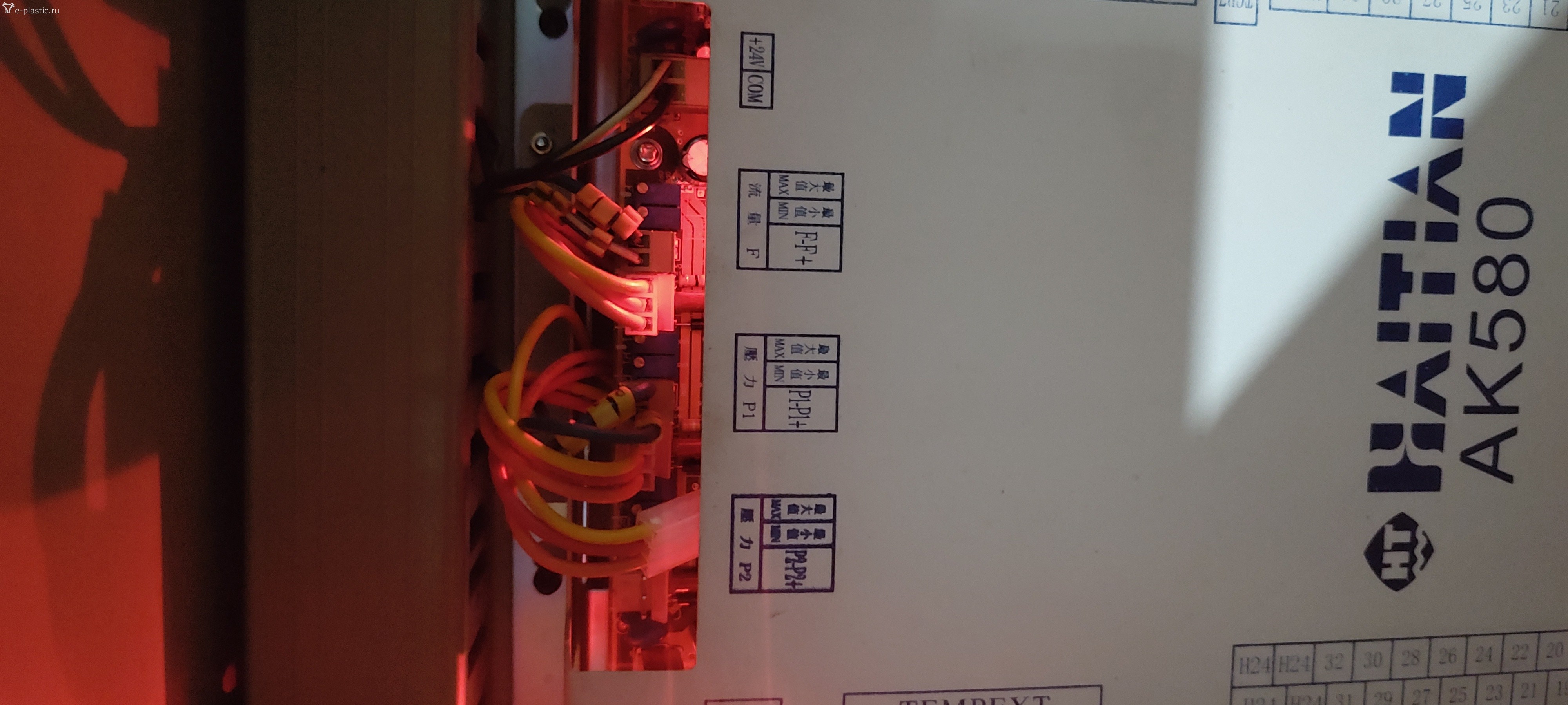 На соответствующей вкладке задаём максимальное давление смыкания 5% (это 0,05 Ампер тока и 1600 бар х 5% = 80 бар давления в гидросистеме). Удерживая кнопку "ФОРМУ ЗАКРЫТЬ", проверяем соответствие показаний амперметра и манометра расчётным значениям. При необходимости ток можно изменить подстроечным резистором "min", расположенным на плате контроллера рядом с разъёмом P1 (P1-P1+), в верхней части фото.