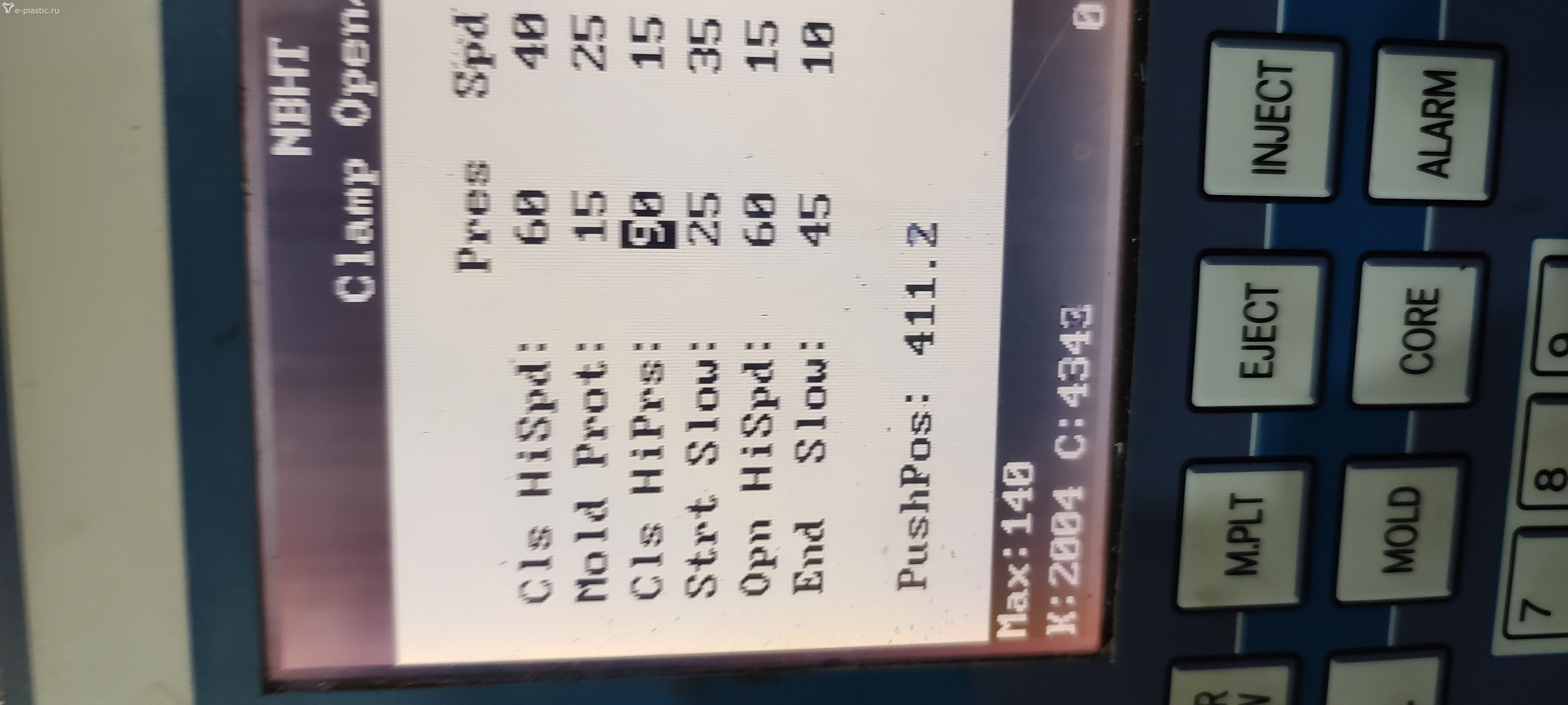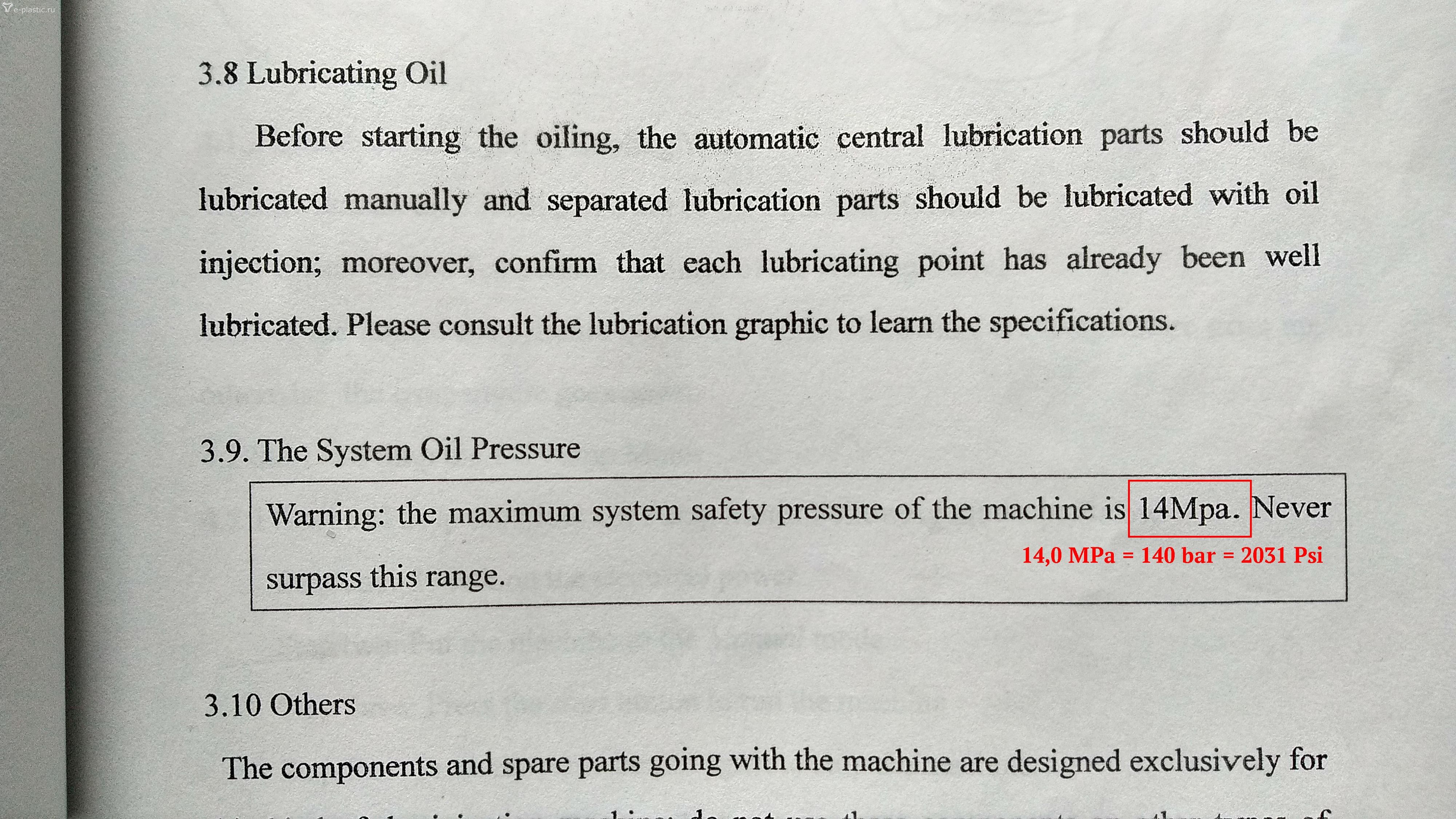 При любой настройке станка нужно руководствоваться паспортом на этот станок, где должны быть указаны базовые значения всех параметров, а также здравым смыслом. Попался мне станок из серии HS с усилием смыкания 150 тонн*сила. В основных параметрах станка значения максимального давления в системе не оказалось, но зато оно нашлось в тексте - 14 MPa (фото 03).