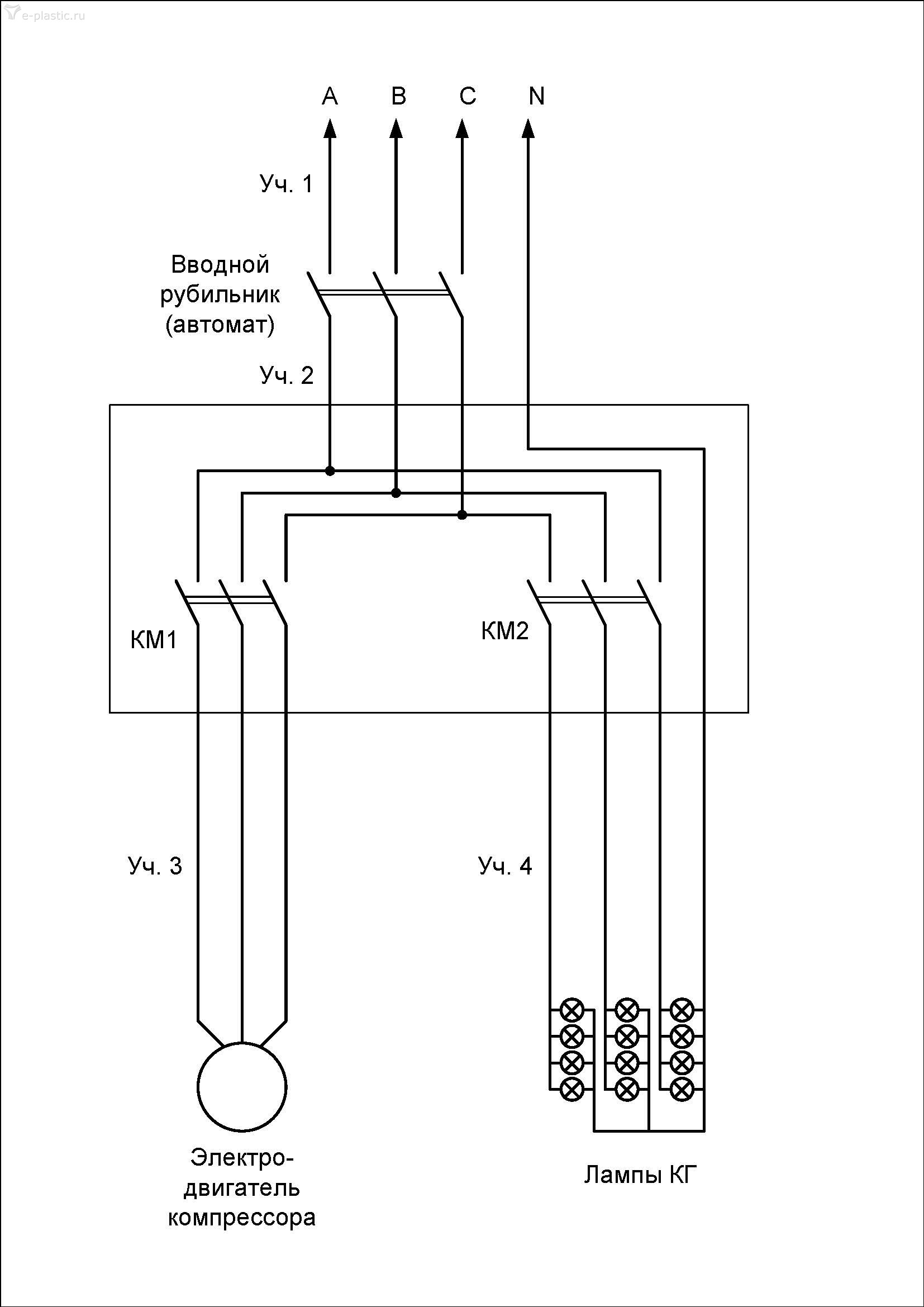 Теперь немного об электроснабжении. Поскольку ответа на некоторые вопросы не получил, но сам нарисовал предполагаемую схему установки. Предполагаю, что лампы разнесены по фазам. Для оценки влияния проложенных кабельных линий на данную проблему, а также взгляда в целом, необходима информация об ЭД компрессора (как уже ранее писал - лучше шильдик), а также длины и сечения кабельных линий - ну хотя бы Уч.3 и Уч.4. Предполагаю, что питание самого шкафа установки выполнено кабельной линией достаточного сечения. Хотя тоже было бы интересно узнать.