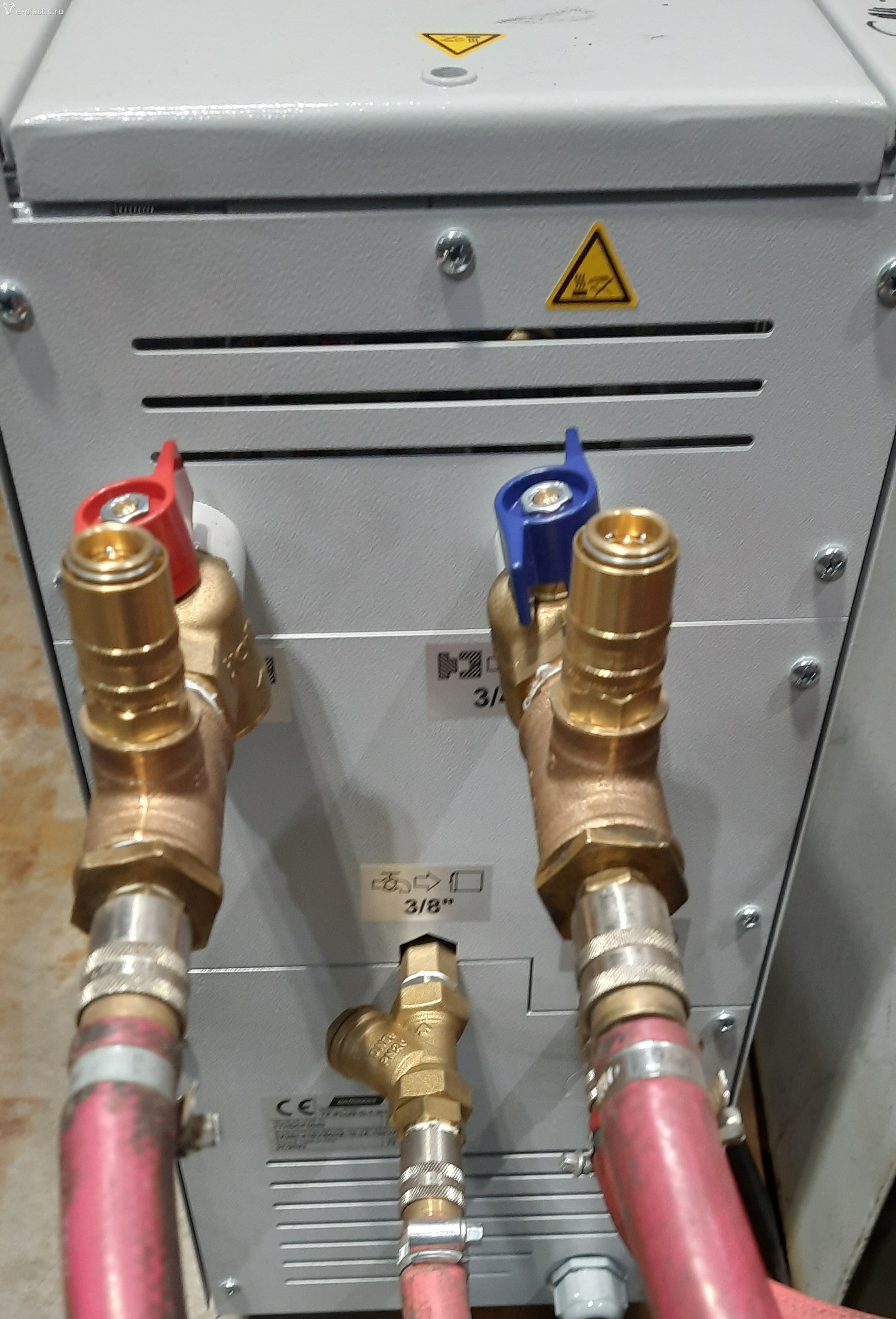 Ещё один нюанс. При выключении термостата , давление сохраняется . Поэтому, если сразу снимать шланги с формы, можно получить струю воды в морду лица :-): . А там 160 градусов . Поэтому на экране есть значок сброса давления. Нажимаем и ждём . Аппарат охлаждается градусов до 40 и сбрасывает давление сам . Если нужно быстрее, мы поставили подключения с клапаном. Всем известные. Выдавил папу , давление сбросил . Маленькие канистры с шлангами и папа штуцер на конце . Кое где ставили краны . Тоже работает.