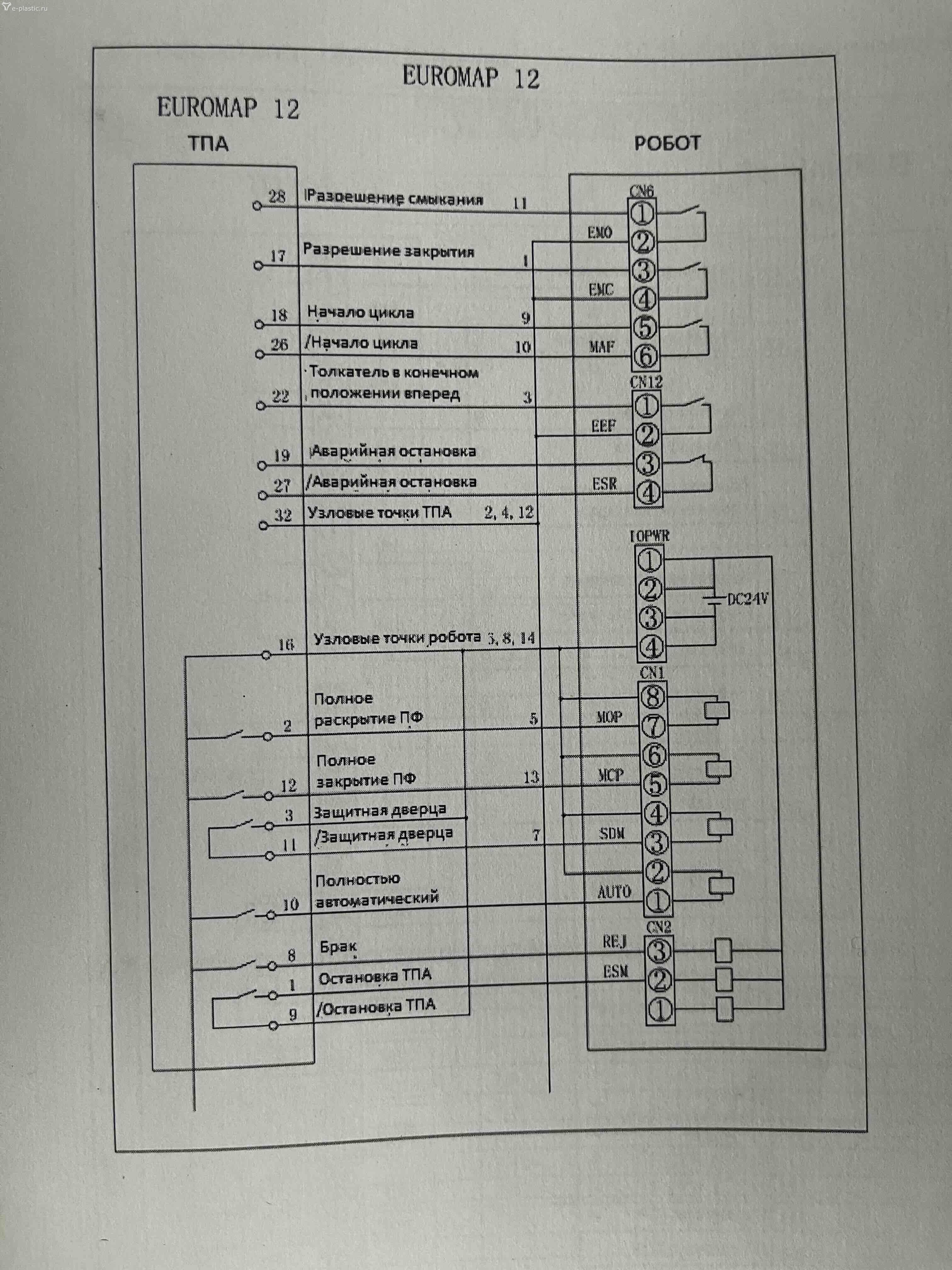 Добрый день. На счёт заглушки верно подмечено. На одном из роботов есть на этот случай два разъема Robot ON и Robot OFF, если посмотреть внутри - та же самая заглушка по сути, разве что не нужно вынимать разъем из ТПА, но придётся лезть наверх к роботу, чтобы переткнуть разъем.IgorChEn писал(а): ↑24 июл 2024, 08:52Добрый день. Лет 6 назад я пытался установить Euromap 67 в станок с контроллером AK668, не Haitian. Ценник был такого же порядка. Есть один момент о котором китайцы молчат. В полноценном евромапе при отключении робота в этот же разъем устанавливается заглушка. В китайском варианте это делается программно, хотя в документации схема подключения правильная.