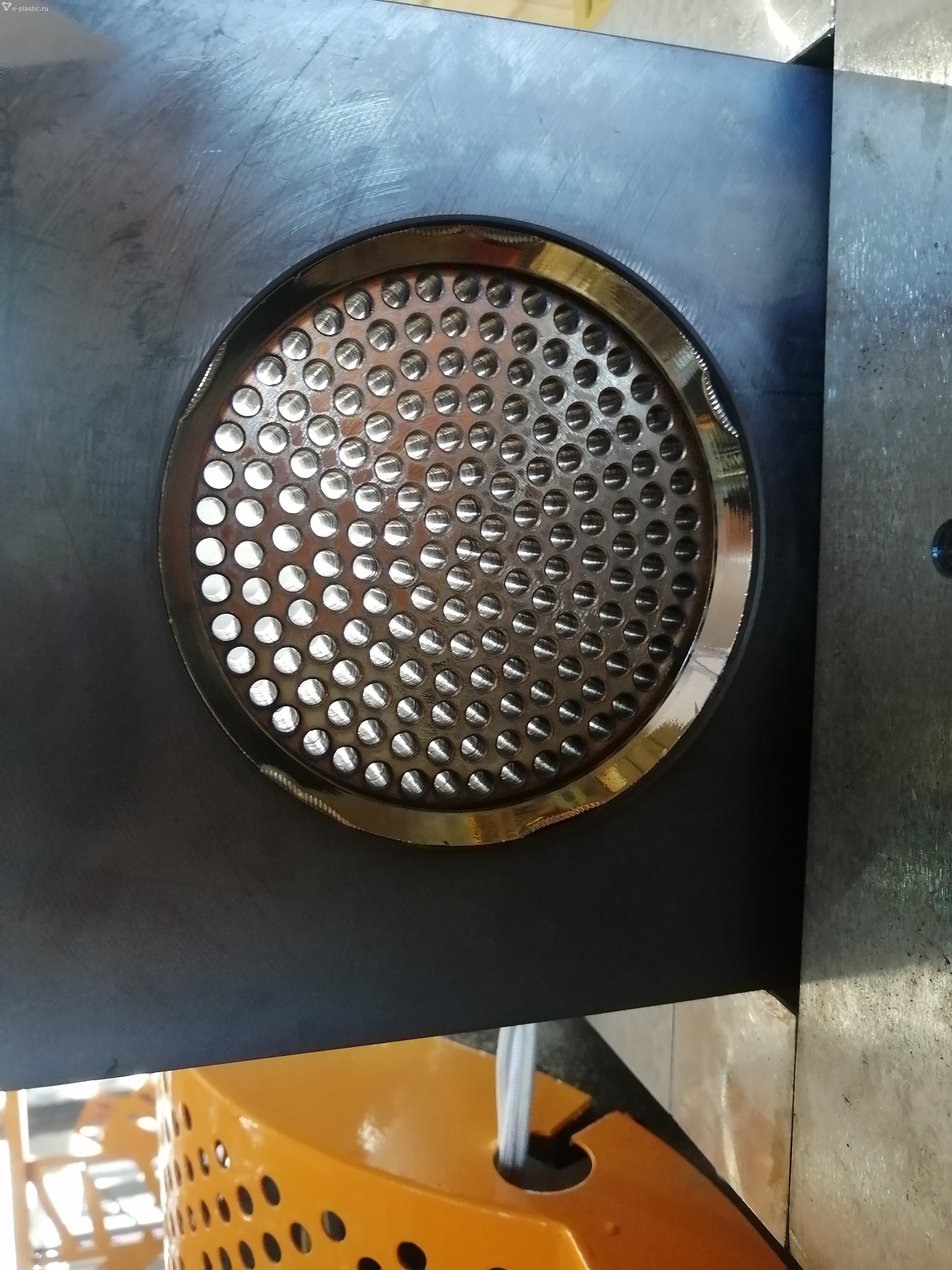 Ничего снимать не надо, сетка вырезается на несколько десятых больше диаметра перфорированной шайбы и плотно прижимается, далее ее придавливает расплавом.