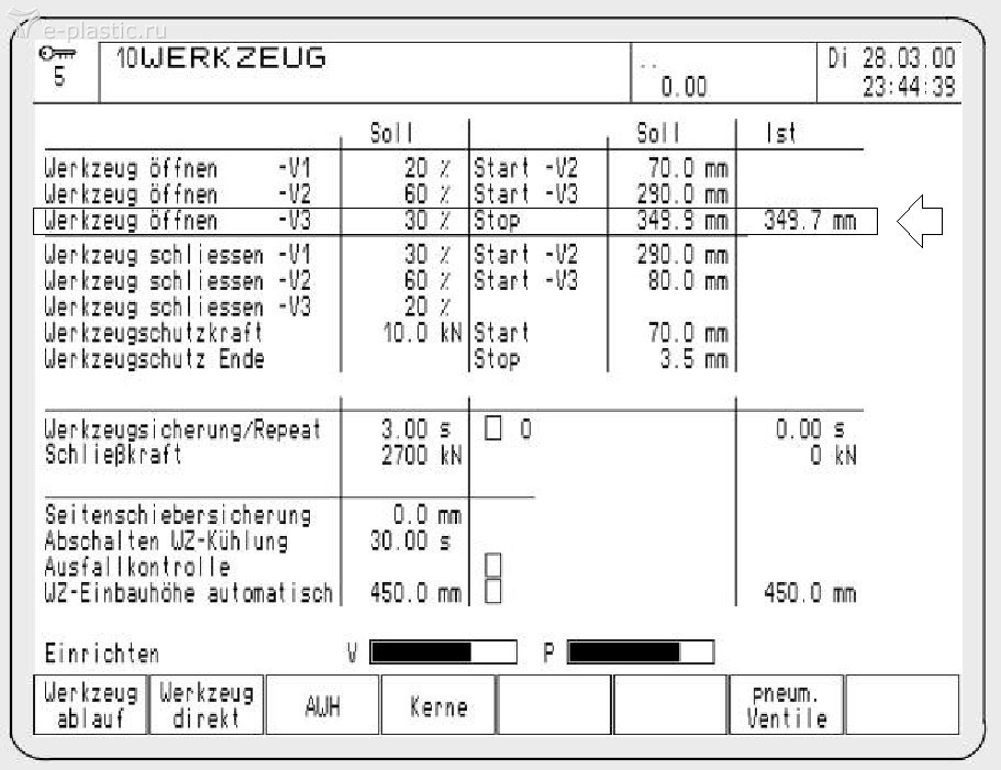 Если вы работаете с пресс-формой, где ход открытия машины механически ограничивается формой, возможно, вы ввели слишком большое значение для параметра "Открыть прессформу - Стоп". Значение - Стоп" слишком велико.