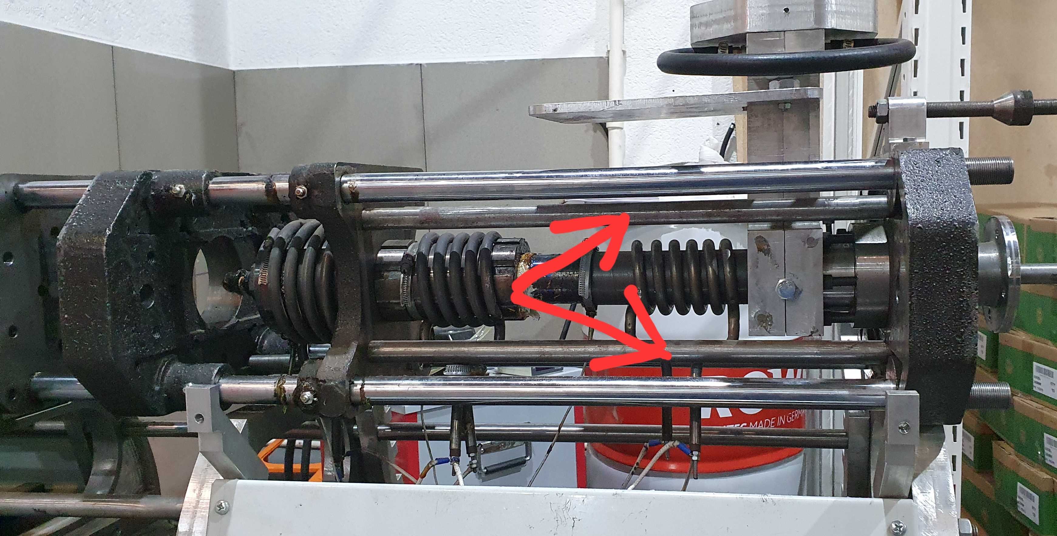 Общий вид нового узла. На стрелки не обращать внимание. Впрыск происходит цикле сжатия, форма доходит до сопла которое далее открывает клапан и масса поступает в форму пока движение не прекратится от сигнала концевиков. В таком состоянии 30 с она выдерживается, затем форма отходит от сопла, размыкается,деталь выпадает. Собственно регулировка одна это ход в цикле сжатия, или объем впрыска.