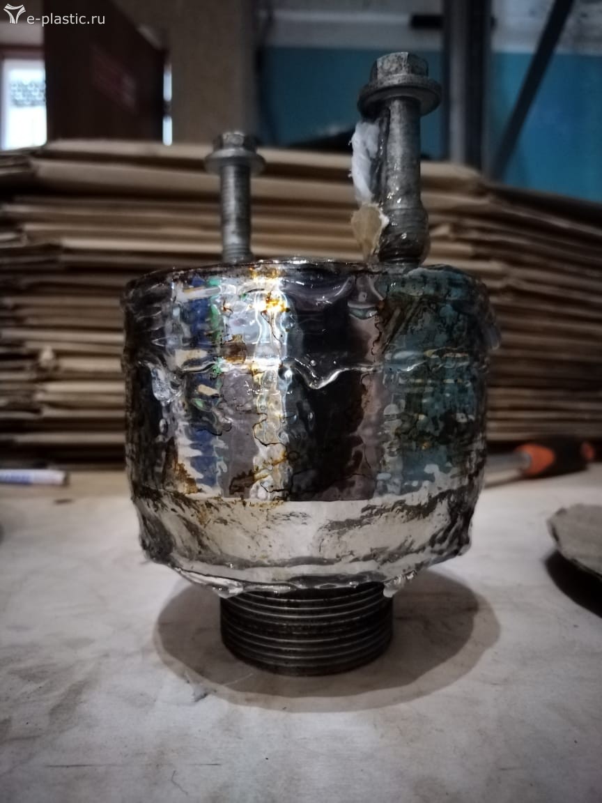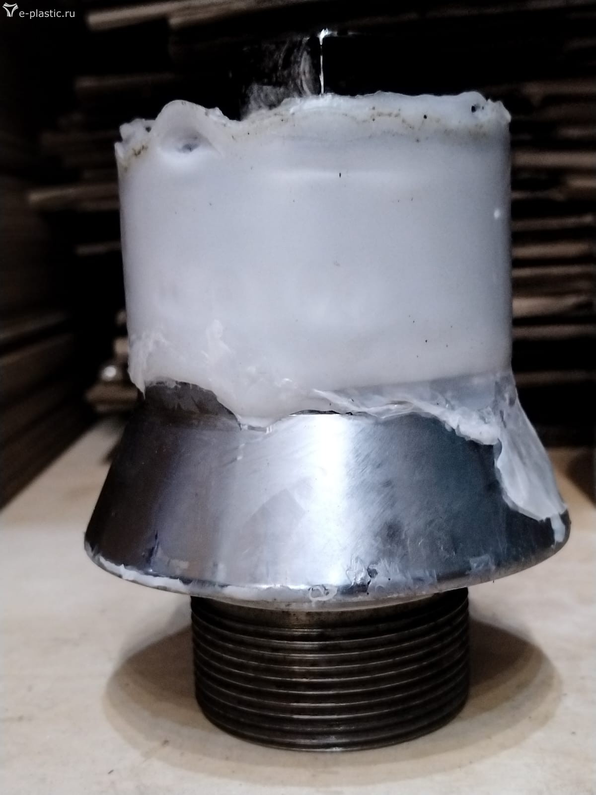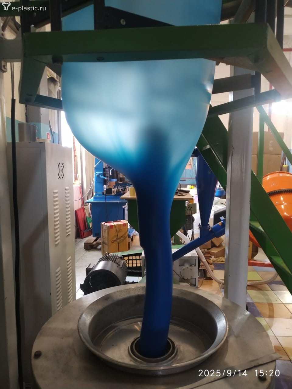 Поменял дорн с матрицей на 80 мм (тот что на фото выше), откалибровал зазор не в ноль, небольшое расхождение есть:+/- 5-10% много или мало не знаю. Расхождение проверял по навескам выдавленного материала из 4-х зон по одной на каждый рулон и микрометром по толщине расплава пока горячий. Проблема на фото (это начало работы: выход на режим): ножка "рюмки" косит в одну сторону от стабилизатора, а пузырь в другую. Потом через час-два работы, вроде, получше, но на шаре полосы и охлаждение происходит на разной высоте, то есть не по кольцу, соответственно через полосу разнотолщинность и морщинки на всем протяжении рукава. Нарезать и намотать в рулон с ровным краям не получается. Иногда рулоны (2 из 4-х) разваливаются при намотке как подзорная труба, при этом на валу подвесил гири с двух сторон, чтобы намотка была плотнее. Подскажите, пожалуйста, в каких направлениях работать? Что может решить эти проблемы? Может быть, есть смысл поменять всю голову (все, что после шнека) на голову с вращением? Устал уже, хочется работать и зарабатывать, с апреля все выходные здесь провожу и все-равно не получается. Очень досадно.