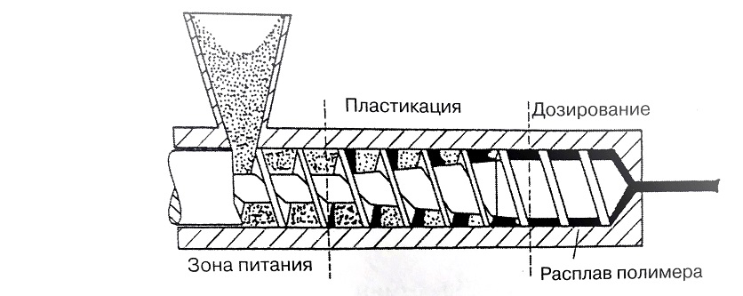 ⦁ В экструдерах, в которых установлены компрессионные шнеки, полимерная пробка создает и поддерживает нужное давление для нормального прохождения материала в шнеке;