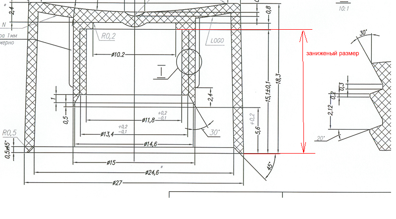 Запускаем новую форму 32 места, центральный горячеканальный впрыск. Используемый материал Moplen 500N аналог Липола А-7, НЕ можем поймать нужную высоту до запорного кольца. Т.е. получается размеры занижены. Как наладкой добиться нормальных размеров? Спасибо